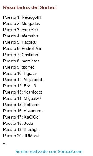 Lista de participantes: Bluelight, FrA1l3, AlejandroL, PacoRu, perinkel, Miguel20, Najarro, XaGiCo, mcrsietes, JNV, JRMoral, santicc, 3edu, gufibuba, Reciogolf4, Caldesport, Lozanakis, xblade, Petepan, C0p4, Alvarouroz, ricardocct, Egiatar, kkirilov, PedroFM6, Cristianp, pi_daikin, enrike10, DIEGOGUTI, Morgades, dtorreci, majestyc14, oblop, afernalva.