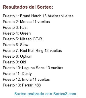 Lista de participantes: Brand Hatch 13 Vueltas vueltas, Imola 11 vueltas, Laguna Seca 13 vueltas, Monza 11 vueltas, Red Bull Ring 12 vueltas, Nissan GT-R, Ferrari 488, Optium, Fast, Green, Slow, Dusty, Old.