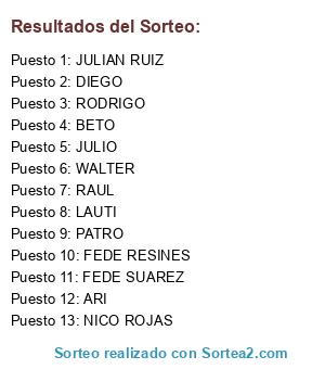 Lista de participantes: PATRO, RODRIGO, ARI, BETO, DIEGO, FEDE RESINES, FEDE SUAREZ, JULIO, JULIAN RUIZ, LAUTI, NICO ROJAS, RAUL, WALTER.