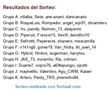 Lista de participantes: Sete, Van_Nicky, titi_axel_14, Perdy_TRS, Raimon_13, moisinho, danicanario, dinamiteru, cclman, Duarte7, Ris, Artero, Francis15, juandy, JAS_73, maykelillo, gores19, Xevi9, RoqueLuis, villalba, Hintoni, Piporuiz, Kaiser, Rompedor, harrytxu, Valentino, Hybrid, davidiho10, Agu_CWM, mescamilla, angel_sqv91, a69tepongo, cipotti, Iru, shanero, ane-anant, Peperecre, Sefirottt, v1k1ng0, sugerman, abayamo, jimeninho84, vicpro76.