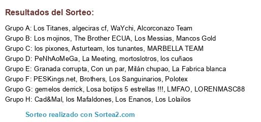 Lista de participantes: Los Messias, Polotex, Granada corrupta, los pixones, los tunantes, Alcorconazo Team, Brothers, WaYchi, Los Enanos, Los Lolailos, La Fabrica blanca, Cad&Mal, Mancos Gold, Con un par, The Brother ECUA, Asturteam, Los mojinos, LORENMASC88, La Meeting, los Mafaldones, gemelos derrick, Milán chupao, LMFAO, PESKings.net, Los Titanes, Losa botijos 5 estrellas !!!, mortoslotros, los cuñaos, algeciras cf, MARBELLA TEAM, PeNhAoMeGa, Los Sanguinarios.