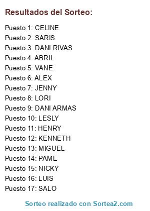 Lista de participantes: ABRIL, CELINE, DANI ARMAS, DANI RIVAS, HENRY, ALEX, JENNY, KENNETH, LESLY, LORI, LUIS, MIGUEL, NICKY, PAME, SARIS, VANE, SALO.