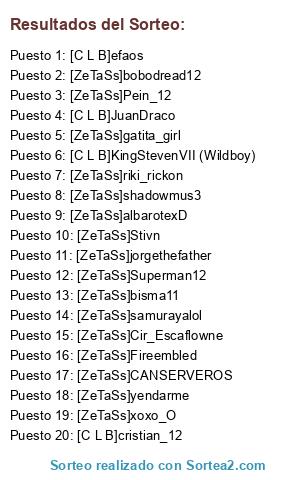 Lista de participantes: [C L B]efaos, [C L B]JuanDraco, [C L B]cristian_12, [C L B]KingStevenVII (Wildboy), [ZeTaSs]Fireembled, [ZeTaSs]albarotexD, [ZeTaSs]CANSERVEROS, [ZeTaSs]bisma11, [ZeTaSs]shadowmus3, [ZeTaSs]yendarme, [ZeTaSs]riki_rickon, [ZeTaSs]Superman12, [ZeTaSs]xoxo_O, [ZeTaSs]samurayalol, [ZeTaSs]gatita_girl, [ZeTaSs]bobodread12, [ZeTaSs]Pein_12, [ZeTaSs]Stivn, [ZeTaSs]Cir_Escaflowne, [ZeTaSs]jorgethefather.