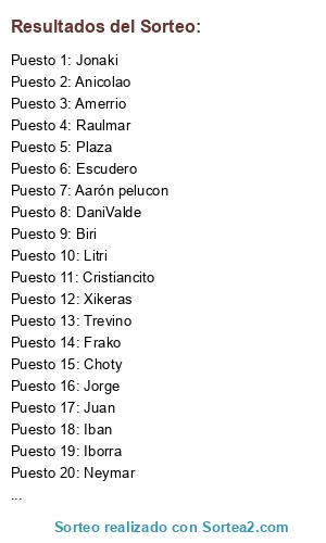 Lista de participantes: arteroman, xx byjonan xx, npg II caos, weass23, trevinoracing27, aaronpelucon, hiphoplito, luisito csg, frakotirador, raulmar, mindix27, xikeras10, plaza corpa, edercocodrilo, danivalde, vengador007, jorgeneymar11, pregal10, enekogarcia, amerrio, iborra, sfc biris norte, anicolao, Iparrita89I.