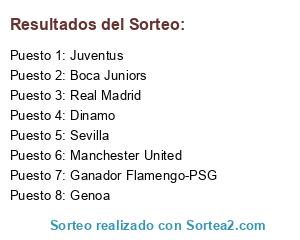 Lista de participantes: Genoa, Real Madrid, Manchester United, Sevilla, Juventus, Boca Juniors, Dinamo, Ganador Flamengo-PSG.