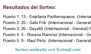 Lista de participantes: 1.- Camii Ailen - (Internacional - General) Físico, 9.- Raul Pinto (Internacional - General) Físico, 21.- Marilyn SH (Internacional - General) Físico, 24.- Carina (Internacional - General) Físico, 26.- Daya55 (Internacional - General) Físico, 27.- Celeste c (Internacional - General) Físico, 28.- Liseth (Internacional - General) Físico, 5.- Rosana Ramirez (Internacional - General) Físico y E-book, 13.- Estefania Parthenopaeus (Internacional - General) Físico y E-book, 20.- Gabi Frik (Internacional - General) Físico y E-book.