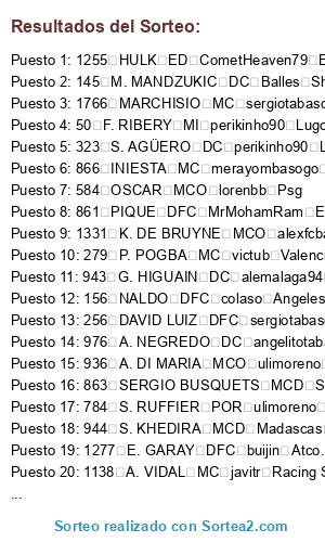 Lista de participantes: 41 M. NEUER POR carlosbode10 Ath. Bilbao, 43 J. BOATENG DFC tabascos89 Roma, 45 P. LAHM MCD TheForceMaker Alcorcon, 47 B. SCHWEINSTEIGER MC TheForceMaker Alcorcon, 48 A. ROBBEN MD Saavexbox Las Palmas, 49 T. MULLER MD ulimoreno Juventus, 50 F. RIBERY MI perikinho90 Lugo, 57 D. ALABA LI sergiotabascos89 Real Madrid, 62 M. HUMMELS DFC Xsamu Manchester United, 66 M. GOTZE MCO colaso Angeles Galaxy, 74 R. LEWANDOWSKI DC gggio92 Eibar, 79 M. REUS MI NandoBel78 Leganes, 112 J. FARFAN MD perikinho90 Lugo, 114 K. HUNTELAAR DC carlosbode10 Ath. Bilbao, 145 M. MANDZUKIC DC Balles Shacktar Donest, 156 NALDO DFC colaso Angeles Galaxy, 178 F. MUSLERA POR SrPistolas86 Rayo Vallecano, 244 P. CECH POR merayombasogo Boca Juniors, 252 D. STURRIDGE DC buijin Atco. Madrid, 254 MATA MCO StorFury Touluse, 256 DAVID LUIZ DFC sergiotabascos89 Real Madrid, 279 P. POGBA MC victub Valencia, 305 L. SUAREZ DC adrylito malaga, 314 J. HART POR benniscuba Everton, 316 V. KOMPANY DFC igosling Barcelona, 319 Y. TOURE MC pinolines Celtic, 321 DAVID SILVA MCO merayombasogo Boca Juniors, 322 S. NASRI MI gggio92 Eibar, 323 S. AGÜERO DC perikinho90 Lugo, 324 C. TEVEZ DC x chachiquesi x Cordoba, 329 E. DZEKO DC sergiotabascos89 Real Madrid, 332 P. ZABALETA LD toni1708 Sevilla, 337 DE GEA POR MrMohamRam Espanyol, 346 W. ROONEY DC x chachiquesi x Cordoba, 414 L. MODRIC MC adrylito Malaga, 474 R. VAN PERSIE DC merayombasogo Boca Juniors, 584 OSCAR MCO lorenbb Psg, 604 NEYMAR DC TheForceMaker Alcorcon, 727 E. HAZARD MI tabascos89 Roma, 754 H. LLORIS POR javitr racing santander, 784 S. RUFFIER POR ulimoreno Juventus, 828 JAVI MARTINEZ DFC carlosbode10 Ath. Bilbao, 844 FALCAO DC perikinho90 Lugo, 845 A. TURAN MI Adriantr127 Arsenal, 846 D. GODIN DFC MrMohamRam Espanyol, 853 DIEGO COSTA DC alemalaga94 benfica, 858 V. VALDES POR Saavexbox Las Palmas, 859 DANI ALVES LD merayombasogo Boca Juniors, 861 PIQUE DFC MrMohamRam Espanyol, 863 SERGIO BUSQUETS MCD SrPistolas86 Rayo Vallecano, 864 XAVI MC TenzorSpain Sp. Gijon, 865 CESC FABREGAS MC benniscuba Everton, 866 INIESTA MC merayombasogo Boca Juniors, 867 L. MESSI MP adrylito Malaga, 870 J. MASCHERANO MCD victub Valencia, 871 A. SANCHEZ ED sergiotabascos89 Real Madrid, 873 PEDRO EI ulimoreno Juventus, 900 SANTI CAZORLA MI angelitotabasco Sp. Lisboa, 906 ISCO MCO misterserpico Sounders, 929 CASILLAS POR sergiotabascos89 Real Madrid, 930 SERGIO RAMOS DFC alemalaga94 benfica, 931 PEPE DFC carlosbode10 Ath. Bilbao, 934 XABI ALONSO MCD victub Valencia, 936 A. DI MARIA MCO ulimoreno Juventus, 937 CRISTIANO RONALDO EI TheForceMaker Alcorcon, 939 K. BENZEMA DC Saavexbox Las Palmas, 943 G. HIGUAIN DC alemalaga94 benfica, 944 S. KHEDIRA MCD Madascas Liverpool, 976 A. NEGREDO DC angelitotabasco Sp. Lisboa, 979 I. RAKITIC MCO TATO XD Depor, 1028 THIAGO SILVA DFC ferminnn Ajax, 1035 Z. IBRAHIMOVIC DC colaso Angeles Galaxy, 1075 A. CANDREVA ED benniscuba Everton, 1118 W. SNEIJDER MCO NandoBel78 Leganes, 1133 BUFFON POR NandoBel78 Leganes, 1135 A. BARZAGLI DFC alead71 Villarreal, 1136 G. CHIELLINI DFC ferminnn Ajax, 1138 A. VIDAL MC javitr Racing Santander, 1185 E. CAVANI DC victub Valencia, 1217 M. PJANIC MC ulimoreno Juventus, 1230 S. HANDANOVIC POR ferminnn Ajax, 1251 N. OTAMENDI DFC perikinho90 Lugo, 1254 JOAO MOUTINHO MC NandoBel78 Leganes, 1255 HULK ED CometHeaven79 Elche, 1259 JAMES RODRIGUEZ MCO victub Valencia, 1277 E. GARAY DFC buijin Atco. Madrid, 1280 N. GAITAN MI javitr racing santander, 1331 K. DE BRUYNE MCO alexfcbarcelona Recreativo, 1610 N. MATIC MCD CometHeaven79 Elche, 1641 C. BRAVO POR KaOs I AsTuR Tottenham, 1662 SIRIGU POR danygp89 Chelsea, 1724 DE ROSSI MCD MrMohamRam Espanyol, 1729 PIRLO MC toni1708 Sevilla, 1732 JACKSON MARTINEZ DC MrMohamRam Espanyol, 1753 T. KROOS MC javitr Racing Santander, 1755 C. VELA ED javitr Racing Santander, 1766 MARCHISIO MC sergiotabascos89 Real Madrid, 1784 T. COURTOIS POR Adriantr127 Arsenal, 1795 M. BENATIA DFC Adriantr127 Arsenal, 1796 MIRANDA DFC Red Dutti Granada, 1797 MATUIDI MCD perikinho90 lugo, 1822 M. VERRATI MC buijin Atco. Madrid, 1858 B. LENO POR adrylito Malaga.