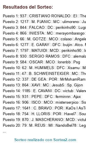 Lista de participantes: 41 M. NEUER POR ferminnn Ajax, 43 J. BOATENG DFC zzzz jona zzzz Everton, 45 P. LAHM MCD TheForceMaker Alcorcon, 47 B. SCHWEINSTEIGER MC TheForceMaker Alcorcon, 48 A. ROBBEN MD Saavexbox Las Palmas, 49 T. MULLER MD ulimoreno Juventus, 50 F. RIBERY MI perikinho90 Lugo, 57 D. ALABA LI sergiotabascos89 Real Madrid, 62 M. HUMMELS DFC Xsamu Manchester United, 66 M. GOTZE MCO colaso Angeles Galaxy, 74 R. LEWANDOWSKI DC Alex1493 Eibar, 79 M. REUS MI NandoBel78 Leganes, 112 J. FARFAN MD perikinho90 Lugo, 114 K. HUNTELAAR DC carlosbode10 Ath. Bilbao, 145 M. MANDZUKIC DC Balles Shacktar Donest, 156 NALDO DFC Platero17 Angeles Galaxy, 178 F. MUSLERA POR SrPistolas86 Rayo Vallecano, 244 P. CECH POR merayombasogo Boca Juniors, 252 D. STURRIDGE DC TheForceMaker Alcorcon, 254 MATA MCO x chachiquesi x Cordoba, 256 DAVID LUIZ DFC sergiotabascos89 Real Madrid, 279 P. POGBA MC victub Valencia, 305 L. SUAREZ DC adrylito malaga, 314 J. HART POR zzzz jona zzzz Everton, 316 V. KOMPANY DFC NandoBel78 Leganes, 319 Y. TOURE MC Jesub5 Sp. Gijon, 321 DAVID SILVA MCO merayombasogo Boca Juniors, 322 S. NASRI MI sergiotabascos89 Real Madrid, 323 S. AGÜERO DC perikinho90 Lugo, 324 C. TEVEZ DC x chachiquesi x Cordoba, 329 E. DZEKO DC sergiotabascos89 Real Madrid, 332 P. ZABALETA LD toni1708 Sevilla, 337 DE GEA POR MrMohamRam Espanyol, 346 W. ROONEY DC Platero17 Angeles Galaxy, 414 L. MODRIC MC adrylito Malaga, 474 R. VAN PERSIE DC merayombasogo Boca Juniors, 584 OSCAR MCO lorenbb Psg, 604 NEYMAR DC TheForceMaker Alcorcon, 727 E. HAZARD MI tabascos89 Roma, 754 H. LLORIS POR Havel7 Southampton, 784 S. RUFFIER POR ulimoreno Juventus, 828 JAVI MARTINEZ DFC carlosbode10 Ath. Bilbao, 844 FALCAO DC perikinho90 Lugo, 845 A. TURAN MI Adriantr127 Arsenal, 846 D. GODIN DFC MrMohamRam Espanyol, 853 DIEGO COSTA DC alemalaga94 benfica, 858 V. VALDES POR Saavexbox Las Palmas, 859 DANI ALVES LD merayombasogo Boca Juniors, 861 PIQUE DFC MrMohamRam Espanyol, 863 SERGIO BUSQUETS MCD zzzz jona zzzz Everton, 864 XAVI MC Jesub5 Sp. Gijon, 865 CESC FABREGAS MC tabascos89 roma, 866 INIESTA MC merayombasogo Boca Juniors, 867 L. MESSI MP adrylito Malaga, 870 J. MASCHERANO MCD victub Valencia, 871 A. SANCHEZ ED sergiotabascos89 Real Madrid, 873 PEDRO EI ulimoreno Juventus, 900 SANTI CAZORLA MI angelitotabasco Sp. Lisboa, 906 ISCO MCO misterserpico Sounders, 929 CASILLAS POR sergiotabascos89 Real Madrid, 930 SERGIO RAMOS DFC alemalaga94 benfica, 931 PEPE DFC ferminnn Ajax, 934 XABI ALONSO MCD victub Valencia, 936 A. DI MARIA MCO ulimoreno Juventus, 937 CRISTIANO RONALDO EI TheForceMaker Alcorcon, 939 K. BENZEMA DC Saavexbox Las Palmas, 943 G. HIGUAIN DC alemalaga94 benfica, 944 S. KHEDIRA MCD FuMe PelusHa Liverpool, 976 A. NEGREDO DC Yelko100 B. Dortmund, 979 I. RAKITIC MCO TATO XD Depor, 1028 THIAGO SILVA DFC carlosbode10 Ath. Bilbao, 1035 Z. IBRAHIMOVIC DC CometHeaven79 Elche, 1075 A. CANDREVA ED zzzz jona zzzz Everton, 1118 W. SNEIJDER MCO NandoBel78 Leganes, 1133 BUFFON POR NandoBel78 Leganes, 1135 A. BARZAGLI DFC alead71 Villarreal, 1136 G. CHIELLINI DFC ferminnn Ajax, 1138 A. VIDAL MC javitr Racing Santander, 1185 E. CAVANI DC victub Valencia, 1217 M. PJANIC MC ulimoreno Juventus, 1230 S. HANDANOVIC POR carlosbode10 Ath. Bilbao, 1251 N. OTAMENDI DFC perikinho90 Lugo, 1254 JOAO MOUTINHO MC NandoBel78 Leganes, 1255 HULK ED n0jan Napoles, 1259 JAMES RODRIGUEZ MCO victub Valencia, 1277 E. GARAY DFC buijin Atco. Madrid, 1280 N. GAITAN MI javitr racing santander, 1331 K. DE BRUYNE MCO alexfcbarcelona Recreativo, 1610 N. MATIC MCD CometHeaven79 Elche, 1641 C. BRAVO POR KaOs I AsTuR Tottenham, 1662 SIRIGU POR danygp89 Chelsea, 1724 DE ROSSI MCD MrMohamRam Espanyol, 1729 PIRLO MC toni1708 Sevilla, 1732 JACKSON MARTINEZ DC MrMohamRam Espanyol, 1753 T. KROOS MC javitr Racing Santander, 1755 C. VELA ED javitr Racing Santander, 1766 MARCHISIO MC sergiotabascos89 Real Madrid, 1784 T. COURTOIS POR Adriantr127 Arsenal, 1795 M. BENATIA DFC Adriantr127 Arsenal, 1796 MIRANDA DFC Red Dutti Granada, 1797 MATUIDI MCD perikinho90 lugo, 1822 M. VERRATI MC buijin Atco. Madrid, 1858 B. LENO POR adrylito Malaga.