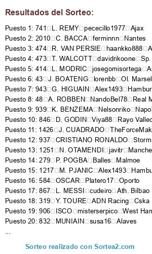 Lista de participantes: 20 ROBERTO FIRMINO Yelko100 Everton, 33 A. SCHURRLE perikinho90 Cordoba, 41 M. NEUER KaOs I AsTuR Oviedo, 43 J. BOATENG lorenbb Ol. Marsella, 45 P. LAHM alead71 Tottenham, 48 A. ROBBEN NandoBel78 Real Madrid, 49 T. MULLER tabascos89 Barcelona, 50 F. RIBERY ManuRRC Fiorentina, 57 D. ALABA Havel7 Psg, 62 M. HUMMELS AlexvsF1 Norwich City, 66 M. GOTZE natadp Lugo, 74 R. LEWANDOWSKI pinolines Sevilla, 79 M. REUS Adriantr127 Atco. Madrid, 81 R. PEREYRA AndrewTorres Real Sociedad, 90 K. BELLARABI javitr Manchester City, 155 SOKRATIS ferminnn Nantes, 156 NALDO n0jan Cristal Palace, 244 P. CECH cudeiro Ath. Bilbao, 252 D. STURRIDGE MrMohamRam Liverpool, 254 MATA TATO XD Depor, 256 DAVID LUIZ misterserpico West Ham, 264 R. LUKAKU Platero17 Oporto, 279 P. POGBA Balles Malmoe, 305 L. SUAREZ xSAMU Benfica, 316 V. KOMPANY victub Valencia, 319 Y. TOURE ADN Racing Cska, 321 DAVID SILVA zzzz jona zzzz Boca Juniors, 323 S. AGÜERO alemalaga94 Bayern Munich, 324 C. TEVEZ Nurhio Orlando City, 334 Y. KONOPLYANKA Balles Malmoe, 337 DE GEA n0jan Cristal Palace, 346 W. ROONEY Ergion46 Monaco, 347 J. HERNANDEZ ulimoreno Juventus, 378 A. TAARABT josegomisortega Aston Villa, 414 L. MODRIC josegomisortega Aston Villa, 415 G. BALE haankko888 Angeles Galaxy, 433 C. BEAUVUE Ergion46 Monaco, 471 A. RAMSEY SrPistolas86 Udinese, 473 T. WALCOTT davidrikoone Sp. Lisboa, 474 R. VAN PERSIE haankko888 Angeles Galaxy, 477 L. KOSCIELNY sergiotabascos89 Manchester United, 478 J. WILSHERE sergiotabascos89 Manchester United, 496 A. MARTIAL TheForceMaker Alcorcon, 584 OSCAR Platero17 Oporto, 604 NEYMAR DaniBke New York City, 609 LUCAS Saavexbox Las Palmas, 635 S. DOUMBIA Goss83 Schalke 04, 660 O. MARTINS ADN Racing Cska, 727 E. HAZARD adrylito Malaga, 741 L. REMY pececillo1977 Ajax, 754 H. LLORIS ManuRRC Fiorentina, 775 J. PASTORE Alex1493 Hamburgo, 778 S. SIRIGU AlexvsF1 Norwich City, 832 MUNIAIN susa16 Alaves, 844 FALCAO alemalaga94 Bayern Munich, 845 A. TURAN Viya88 Rayo Vallecano, 846 D. GODIN Viya88 Rayo Vallecano, 853 DIEGO COSTA danygp89 Bournomenth, 861 PIQUE SpiffiestJose Ol. Lyon, 863 SERGIO BUSQUETS haankko888 Angeles Galaxy, 865 CESC FABREGAS susa16 Alaves, 866 INIESTA pececillo1977 Ajax, 867 L. MESSI cudeiro Ath. Bilbao, 871 A. SANCHEZ sergiord14 Wolsfburgo, 872 THIAGO Ivanxio Sounders, 873 PEDRO natadp Lugo, 900 SANTI CAZORLA Nurhio Orlando City, 904 S. RONDON x chachiquesi x Betis, 906 ISCO misterserpico West Ham, 930 SERGIO RAMOS Goss83 Schalke 04, 933 MARCELO Adriantr127 Atco. Madrid, 934 XABI ALONSO Nelsonriko Napoles, 936 A. DI MARIA ulimoreno Juventus, 937 CRISTIANO RONALDO StormFury elche, 938 M. OZIL pinolines Sevilla, 939 K. BENZEMA Nelsonriko Napoles, 943 G. HIGUAIN Alex1493 Hamburgo, 948 JOSE CALLEJON StormFury elche, 979 I. RAKITIC iSugar v11 B. Moenchengladbach, 999 JORDI ALBA alemalaga94 Bayern Munich, 1028 THIAGO SILVA alead71 Tottenham, 1035 Z. IBRAHIMOVIC TATO XD Depor, 1075 A. CANDREVA MrMohamRam Liverpool, 1118 W. SNEIJDER NandoBel78 Real Madrid, 1136 G. CHIELLINI Yelko100 Everton, 1138 A. VIDAL merayombasogo Ponferradina, 1147 C. MARCHISIO Havel7 Psg, 1185 CAVANI CometHeaven79 Chelsea, 1217 M. PJANIC Alex1493 Hamburgo, 1251 N. OTAMENDI javitr Manchester City, 1255 HULK x chachiquesi x Betis, 1259 JAMES RODRIGUEZ iGosling V9 Arsenal, 1331 K. DE BRUYNE alexfcbarcelona B. Dortmund, 1426 J. CUADRADO TheForceMaker Alcorcon, 1524 PHILIPPE COUTINHO AndrewTorres Real Sociedad, 1610 N. MATIC CometHeaven79 Chelsea, 1619 P. AUBAMEYANG benniscuba Roma, 1668 D. MERTENS sergiord14 Wolsfburgo, 1729 PIRLO davidrikoone Sp. Lisboa, 1730 ERIKSEN zzzz jona zzzz Boca Juniors, 1732 JACKSON MARTINEZ AndrewTorres Real Sociedad, 1750 RAMIRES sergiotabascos89 Manchester United, 1753 KROOS iSugar v11 B. Moenchengladbach, 1755 C. VELA adrylito Malaga, 1756 WITSEL trunks Levante, 1757 GUNDOGAN danygp89 Bournomenth, 1758 R. NAINGGOLAN benniscuba Roma, 1784 T. COURTOIS SpiffiestJose Ol. Lyon, 1797 MATUIDI Ergion46 Monaco, 1803 R. STERLING SrPistolas86 Udinese, 1822 M. VERRATTI HaLiToxGCFx Granada, 1825 C. BENTEKE perikinho90 Cordoba, 1826 R. VARANE sergiotabascos89 Manchester United, 1840 WILLIAN SrPistolas86 Udinese, 1842 KOKE toni1708 Celta, 1852 MARQUINHOS tabascos89 Barcelona, 1858 B. LENO merayombasogo Ponferradina, 1879 A. ABDENNOUR alexfcbarcelona B. Dortmund, 1888 A. LACAZETTE Saavexbox Las Palmas, 1906 A. MORATA Ivanxio Sounders, 1907 A. GRIEZMANN x iReViiVaL FoX River Plate, 1933 P. DYBALA HaLiToxGCFx Granada, 1969 DOUGLAS COSTA trunks Levante, 1994 DEPAY Red Dutti B. Leverkusen, 2010 C. BACCA ferminnn Nantes, 2015 PACO ALCACER toni1708 Celta, 2017 L. VIETTO x iReViiVaL FoX River Plate, 2030 A. LAPORTE KaOs I AsTuR Oviedo.