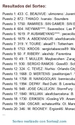 Lista de participantes: 20 ROBERTO FIRMINO Dj Calavera xXx Everton, 33 A. SCHURRLE perikinho90 Cordoba, 41 M. NEUER KaOs I AsTuR Oviedo, 43 J. BOATENG echateunfifa Ol. Marsella, 45 P. LAHM alead71 Tottenham, 48 A. ROBBEN**** victub Valencia, 49 T. MULLER Maybecohen Zaragoza, 50 F. RIBERY alexhdz Fiorentina, 57 D. ALABA Havel7 Psg, 62 M. HUMMELS ChaoticHornet67 Toronto, 66 M. GOTZE P3drito Sion, 74 R. LEWANDOWSKI Havel7 Psg, 79 M. REUS SIN GAMER SIN EQUIPO, 81 R. PEREYRA sergiotabascos89 Manchester United, 90 K. BELLARABI Alex1493 Napoles, 155 SOKRATIS ferminnn Nantes, 156 NALDO Saavexbox Las Palmas, 244 P. CECH PABLINHO Ath. Bilbao, 252 D. STURRIDGE MrMohamRam Liverpool, 254 MATA sergiotabascos89 Manchester United, 256 DAVID LUIZ misterserpico West Ham, 264 R. LUKAKU andrey8y8 Oporto, 279 P. POGBA Balles Malmoe, 305 L. SUAREZ xSAMU Benfica, 316 V. KOMPANY victub Valencia, 319 Y. TOURE alead71 Tottenham, 321 DAVID SILVA benniscuba Roma, 323 S. AGÜERO alemalaga94 Bayern Munich, 324 C. TEVEZ Nurhio Orlando City, 334 Y. KONOPLYANKA Balles Malmoe, 337 DE GEA gabripf Cristal Palace, 346 W. ROONEY Ergion46 Monaco, 347 J. HERNANDEZ Shaman1987 Red Bulls, 378 A. TAARABT trompexbox360 Chicago Fire, 414 L. MODRIC trompexbox360 Chicago Fire, 415 G. BALE adrylito Malaga, 433 C. BEAUVUE ulimoreno Juventus, 471 A. RAMSEY SrPistolas86 Udinese, 473 T. WALCOTT Saavexbox Las Palmas, 474 R. VAN PERSIE CometHeaven79 Chelsea, 477 L. KOSCIELNY sergiotabascos89 Manchester United, 478 J. WILSHERE misterserpico West Ham, 496 A. MARTIAL TheForceMaker Alcorcon, 584 OSCAR echateunfifa Ol. Marsella, 604 NEYMAR**** Saavexbox Las Palmas, 609 LUCAS Saavexbox Las Palmas, 635 S. DOUMBIA Goss83 Schalke 04, 660 O. MARTINS x iReViiVaL FoX River Plate, 727 E. HAZARD merayombasogo Ponferradina, 741 L. REMY Red Dutti B. Leverkusen, 754 H. LLORIS sergiotabascos89 Manchester United, 775 J. PASTORE iGosling V9 Arsenal, 778 S. SIRIGU javitr Manchester City, 832 MUNIAIN Ramillos666 Alaves, 844 FALCAO SrPistolas86 Udinese, 845 A. TURAN gabripf Cristal Palace, 846 D. GODIN tabascos89 Barcelona, 853 DIEGO COSTA alemalaga94 Bayern Munich, 861 PIQUE SpiffiestJose Ol. Lyon, 863 SERGIO BUSQUETS StormFury elche, 865 CESC FABREGAS iRandy V8 Boca Juniors, 866 INIESTA Goss83 Schalke 04, 867 L. MESSI PABLINHO Ath. Bilbao, 871 A. SANCHEZ joselitorojas1 Wolsfburgo, 872 THIAGO Ivanxio Sounders, 873 PEDRO Shaman1987 Red Bulls, 900 SANTI CAZORLA Nurhio Orlando City, 904 S. RONDON x chachiquesi x Betis, 906 ISCO**** iRandy V8 Boca Juniors, 930 SERGIO RAMOS Goss83 Schalke 04, 933 MARCELO Adriantr127 Atco. Madrid, 934 XABI ALONSO Ivanxio Sounders, 936 A. DI MARIA ulimoreno Juventus, 937 CRISTIANO RONALDO Saavexbox Las Palmas, 938 M. OZIL pinolines Sevilla, 939 K. BENZEMA javitr Manchester City, 943 G. HIGUAIN MrMohamRam Liverpool, 948 JOSE CALLEJON StormFury elche, 979 I. RAKITIC xSAMU Benfica, 999 JORDI ALBA Saavexbox Las Palmas, 1028 THIAGO SILVA sergiotabascos89 Manchester United, 1035 Z. IBRAHIMOVIC TATO XD Depor, 1075 A. CANDREVA javitr Manchester City, 1118 W. SNEIJDER SIN GAMER SIN EQUIPO, 1136 G. CHIELLINI Dj Calavera xXx Everton, 1138 A. VIDAL Shaman1987 Red Bulls, 1147 C. MARCHISIO pinolines Sevilla, 1185 CAVANI CometHeaven79 Chelsea, 1217 M. PJANIC pinolines Sevilla, 1251 N. OTAMENDI javitr Manchester City, 1255 HULK x chachiquesi x Betis, 1259 JAMES RODRIGUEZ**** misterserpico West Ham, 1331 K. DE BRUYNE alexfcbarcelona B. Dortmund, 1426 J. CUADRADO TheForceMaker Alcorcon, 1524 PHILIPPE COUTINHO AndrewTorres Real Sociedad, 1610 N. MATIC CometHeaven79 Chelsea, 1619 P. AUBAMEYANG**** pececillo1977 Ajax, 1668 D. MERTENS joselitorojas1 Wolsfburgo, 1729 PIRLO gabripf Cristal Palace, 1730 ERIKSEN iGosling V9 Arsenal, 1732 JACKSON MARTINEZ sergiotabascos89 Manchester United, 1750 RAMIRES SIN GAMER SIN EQUIPO, 1753 KROOS sergiotabascos89 Manchester United, 1755 C. VELA**** SpiffiestJose Ol. Lyon, 1756 WITSEL trunks Levante, 1757 GUNDOGAN danygp89 Bournomenth, 1758 R. NAINGGOLAN benniscuba Roma, 1784 T. COURTOIS SpiffiestJose Ol. Lyon, 1797 MATUIDI Ergion46 Monaco, 1803 R. STERLING SrPistolas86 Udinese, 1822 M. VERRATTI**** sergiotabascos89 Manchester United, 1825 C. BENTEKE perikinho90 Cordoba, 1826 R. VARANE sergiotabascos89 Manchester United, 1840 WILLIAN alexfcbarcelona B. Dortmund, 1842 KOKE toni1708 Celta, 1852 MARQUINHOS Pyra el Capo Angeles Galaxy, 1858 B. LENO alemalaga94 Bayern Munich, 1879 A. ABDENNOUR alexfcbarcelona B. Dortmund, 1888 A. LACAZETTE Pyra el Capo Angeles Galaxy, 1906 A. MORATA adrylito Malaga, 1907 A. GRIEZMANN adrylito Malaga, 1933 P. DYBALA HaLiToxGCFx Granada, 1969 DOUGLAS COSTA trunks Levante, 1994 DEPAY Red Dutti B. Leverkusen, 2010 C. BACCA Ergion46 Monaco, 2015 PACO ALCACER HaLiToxGCFx Granada, 2017 L. VIETTO Albervil Rayo Vallecano, 2030 A. LAPORTE KaOs I AsTuR Oviedo.