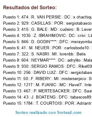Lista de participantes: 41 M. NEUER POR carlosbode10 Ath. Bilbao, 43 J. BOATENG DFC tabascos89 Roma, 45 P. LAHM MCD TheForceMaker Alcorcon, 47 B. SCHWEINSTEIGER MC Saavexbox Las Palmas, 48 A. ROBBEN MD Rikel09 Fiorentina, 49 T. MULLER MD ulimoreno Juventus, 50 F. RIBERY MI misterserpico Sounders, 51 M. GOMEZ DC javitr Racing Santander, 62 M. HUMMELS DFC Xsamu Manchester United, 66 M. GOTZE**** MCO misterserpico Sounders, 74 R. LEWANDOWSKI**** DC cruz88 Southend, 79 M. REUS MI NandoBel78 Leganes, 112 J. FARFAN MD perikinho90 lugo, 114 K. HUNTELAAR DC carlosbode10 Ath. Bilbao, 145 M. MANDZUKIC DC igosling Barcelona, 244 P. CECH POR Havel7 Inter de Milan, 247 J. TERRY DFC javicobarro Ac Milan, 252 D. STURRIDGE DC alemalaga94 benfica, 254 MATA MCO KaOs I AsTuR Tottenham, 256 DAVID LUIZ DFC sergiotabascos89 Real Madrid, 262 ALEX DFC jesus022 Villarreal, 279 P. POGBA MC TheForceMaker Alcorcon, 301 S. GERRARD MCD Xsamu Manchester United, 305 L. SUAREZ DC Rikel09 Fiorentina, 316 V. KOMPANY DFC ferminnn Ajax, 319 Y. TOURE MC pinolines Celtic, 321 DAVID SILVA MCO sergiotabascos89 Real Madrid, 322 S. NASRI MI lorenbb Betis, 323 S. AGÜERO DC perikinho90 Lugo, 324 C. TEVEZ DC x chachiquesi x Cordoba, 329 E. DZEKO DC adizero1drose America, 340 N. VIDIC DFC SSpecializeDD Manchester City, 346 W. ROONEY**** DC NandoBel78 Leganes, 381 DIEGO COSTA DC buijin Atco. Madrid, 414 L. MODRIC MC adrylito Malaga, 415 G. BALE MD cudeiro B. Leverkusen, 467 P. MERTESACKER DFC Saavexbox Las Palmas, 471 A. RAMSEY MC Rikel09 Fiorentina, 474 R. VAN PERSIE DC x chachiquesi x Cordoba, 584 OSCAR**** MCO crivi Llagostera, 604 NEYMAR**** DC adrylito Malaga, 609 LUCAS ED adizero1drose America, 727 E. HAZARD MI tabascos89 Roma, 754 H. LLORIS POR javitr Psg, 828 JAVI MARTINEZ DFC carlosbode10 Ath. Bilbao, 844 FALCAO DC perikinho90 Lugo, 846 D. GODIN**** DFC merayombasogo Boca Juniors, 859 DANI ALVES LD merayombasogo Boca Juniors, 861 PIQUE DFC MrMohamRam Espanyol, 863 SERGIO BUSQUETS MCD Crivi Llagostera, 864 XAVI MC tabascos89 Roma, 865 CESC FABREGAS MC lorenbb Betis, 866 INIESTA MC merayombasogo Boca Juniors, 867 L. MESSI MP adrylito Malaga, 870 J. MASCHERANO MCD perikinho90 Lugo, 871 A. SANCHEZ ED sergiotabascos89 Real Madrid, 873 PEDRO EI Saavexbox Las Palmas, 897 J. TOULALAN MCD pablotp48 B. Dortmund, 900 SANTI CAZORLA MI MrMohamRam Espanyol, 906 ISCO MCO misterserpico Sounders, 929 CASILLAS POR sergiotabascos89 Real Madrid, 930 SERGIO RAMOS DFC Rikel09 Fiorentina, 931 PEPE DFC carlosbode10 Ath. Bilbao, 934 XABI ALONSO MCD victub Valencia, 936 A. DI MARIA MCO ulimoreno Juventus, 937 CRISTIANO RONALDO EI TheForceMaker Alcorcon, 938 M. OZIL**** MCO Rikel09 Fiorentina, 939 K. BENZEMA DC Saavexbox Las Palmas, 943 G. HIGUAIN DC alemalaga94 Benfica, 944 S. KHEDIRA MCD Rikel09 Fiorentina, 971 JESUS NAVAS MD MrMohamRam Espanyol, 976 A. NEGREDO DC jesub Monaco, 979 I. RAKITIC MCO TATO XD Depor, 1028 THIAGO SILVA DFC ferminnn Ajax, 1035 Z. IBRAHIMOVIC DC crivi Llagostera, 1075 A. CANDREVA ED javitr Racing Santander, 1118 W. SNEIJDER MCO NandoBel78 Leganes, 1122 T. MOTTA MCD SSpecializeDD Manchester City, 1135 A. BARZAGLI DFC jesus022 Villarreal, 1136 G. CHIELLINI DFC perikinho90 Lugo, 1138 A. VIDAL MC alemalaga94 benfica, 1184 E. LAVEZZI EI alemalaga94 benfica, 1185 E. CAVANI DC victub Valencia, 1217 M. PJANIC MC Havel7 Inter de Milan, 1254 JOAO MOUTINHO MC NandoBel78 Leganes, 1255 HULK*** ED TheForceMaker Alcorcon, 1259 JAMES RODRIGUEZ MCO victub Valencia, 1277 E. GARAY DFC Saavexbox Las Palmas, 1426 J. CUADRADO MD ulimoreno Juventus, 1724 DE ROSSI MCD adrylito Malaga, 1729 PIRLO MC javicobarro Ac Milan, 1730 ERIKSEN MI lorenbb Betis, 1744 HAMSIK MCO Havel7 Inter de Milan, 1753 KROOS MC javitr Racing Santander, 1757 GUNDOGAN MC merayombasogo Boca Juniors, 1766 MARCHISIO MC perikinho90 Lugo, 1784 T. COURTOIS POR Adriantr127 Arsenal, 1795 M. BENATIA DFC Adriantr127 Arsenal, 1796 MIRANDA DFC igosling Barcelona, 1797 MATUIDI MCD igosling Barcelona.
