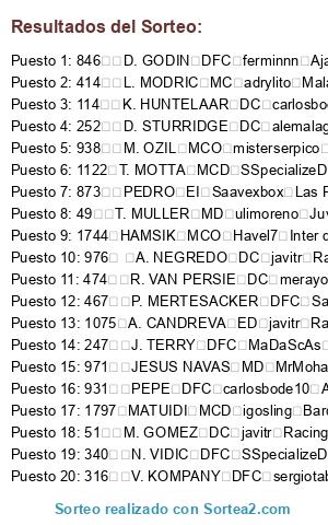Lista de participantes: 41 M. NEUER POR carlosbode10 Ath. Bilbao, 43 J. BOATENG DFC tabascos89 Roma, 45 P. LAHM MCD TheForceMaker Alcorcon, 47 B. SCHWEINSTEIGER MC TheForceMaker Alcorcon, 48 A. ROBBEN MD guerrita8 Fiorentina, 49 T. MULLER MD ulimoreno Juventus, 50 F. RIBERY MI perikinho90 lugo, 51 M. GOMEZ DC javitr Racing Santander, 62 M. HUMMELS DFC Xsamu Manchester United, 66 GOTZE MCO guerrita8 Fiorentina, 74 R. LEWANDOWSKI DC adrylito Malaga, 79 M. REUS MI NandoBel78 Leganes, 112 J. FARFAN MD perikinho90 lugo, 114 K. HUNTELAAR DC carlosbode10 Ath. Bilbao, 145 M. MANDZUKIC DC igosling Barcelona, 244 P. CECH POR merayombasogo Boca Juniors, 247 J. TERRY DFC MaDaScAs Ac Milan, 252 D. STURRIDGE DC alemalaga94 benfica, 254 MATA MCO KaOs I AsTuR Tottenham, 256 DAVID LUIZ DFC sergiotabascos89 Real Madrid, 262 ALEX DFC alead71 Villarreal, 279 P. POGBA MC TheForceMaker Alcorcon, 301 S. GERRARD MCD Xsamu Manchester United, 305 L. SUAREZ DC guerrita8 Fiorentina, 316 V. KOMPANY DFC sergiotabascos89 Real Madrid, 319 Y. TOURE MC pinolines Celtic, 321 DAVID SILVA MCO merayombasogo Boca Juniors, 322 S. NASRI MI lorenbb Betis, 323 S. AGÜERO DC perikinho90 Lugo, 324 C. TEVEZ DC x chachiquesi x Cordoba, 329 E. DZEKO DC MaDaScAs Ac Milan, 340 N. VIDIC DFC SSpecializeDD Manchester City, 346 W. ROONEY DC Saavexbox Las Palmas, 381 DIEGO COSTA**** DC Cruz8 Southend United, 414 L. MODRIC MC adrylito Malaga, 415 G. BALE MD ggio92 B. Leverkusen, 467 P. MERTESACKER DFC Saavexbox Las Palmas, 471 A. RAMSEY MC guerrita8 Fiorentina, 474 R. VAN PERSIE DC merayombasogo Boca Juniors, 584 OSCAR MCO benniscuba Everton, 604 NEYMAR**** DC buijin Malaga, 609 LUCAS ED Demente MC Sevilla, 727 E. HAZARD MI tabascos89 Roma, 754 H. LLORIS POR ferminnn Ajax, 828 JAVI MARTINEZ DFC carlosbode10 Ath. Bilbao, 844 FALCAO DC perikinho90 Lugo, 846 D. GODIN DFC ferminnn Ajax, 859 DANI ALVES LD merayombasogo Boca Juniors, 861 PIQUE DFC MrMohamRam Espanyol, 863 SERGIO BUSQUETS MCD Crivi Llagostera, 864 XAVI MC tabascos89 Roma, 865 CESC FABREGAS MC lorenbb Betis, 866 INIESTA MC merayombasogo Boca Juniors, 867 L. MESSI MP adrylito Malaga, 870 J. MASCHERANO MCD perikinho90 Lugo, 871 A. SANCHEZ ED sergiotabascos89 Real Madrid, 873 PEDRO EI Saavexbox Las Palmas, 897 J. TOULALAN MCD Yelko100 B. Dortmund, 900 SANTI CAZORLA MI MrMohamRam Espanyol, 906 ISCO MCO misterserpico Sounders, 929 CASILLAS POR sergiotabascos89 Real Madrid, 930 SERGIO RAMOS DFC guerrita8 Fiorentina, 931 PEPE DFC carlosbode10 Ath. Bilbao, 934 XABI ALONSO MCD victub Valencia, 936 A. DI MARIA MCO ulimoreno Juventus, 937 CRISTIANO RONALDO EI TheForceMaker Alcorcon, 938 M. OZIL MCO misterserpico Sounders, 939 K. BENZEMA DC Saavexbox Las Palmas, 943 G. HIGUAIN DC alemalaga94 Benfica, 944 S. KHEDIRA MCD guerrita8 Fiorentina, 971 JESUS NAVAS MD MrMohamRam Espanyol, 976 A. NEGREDO DC javitr Racing Santander, 979 I. RAKITIC MCO TATO XD Depor, 1028 THIAGO SILVA DFC ferminnn Ajax, 1035 Z. IBRAHIMOVIC DC crivi Llagostera, 1075 A. CANDREVA ED javitr Racing Santander, 1118 W. SNEIJDER MCO NandoBel78 Leganes, 1122 T. MOTTA MCD SSpecializeDD Manchester City, 1135 A. BARZAGLI DFC jesus022 Villarreal, 1136 G. CHIELLINI DFC perikinho90 Lugo, 1138 A. VIDAL MC alemalaga94 benfica, 1184 E. LAVEZZI EI alemalaga94 benfica, 1185 E. CAVANI DC victub Valencia, 1217 M. PJANIC MC Havel7 Inter de Milan, 1254 JOAO MOUTINHO MC NandoBel78 Leganes, 1255 HULK ED NandoBel78 Leganes, 1259 JAMES RODRIGUEZ MCO victub Valencia, 1277 E. GARAY DFC Saavexbox Las Palmas, 1426 J. CUADRADO MD ulimoreno Juventus, 1724 DE ROSSI MCD adrylito Malaga, 1729 PIRLO MC Demente MC Sevilla, 1730 ERIKSEN MI lorenbb Betis, 1744 HAMSIK MCO Havel7 Inter de Milan, 1753 KROOS MC javitr Racing Santander, 1757 GUNDOGAN MC danygp89 Chelsea, 1766 MARCHISIO MC perikinho90 Lugo, 1784 T. COURTOIS POR Adriantr127 Arsenal, 1795 M. BENATIA DFC Adriantr127 Arsenal, 1796 MIRANDA DFC igosling Barcelona, 1797 MATUIDI MCD igosling Barcelona.