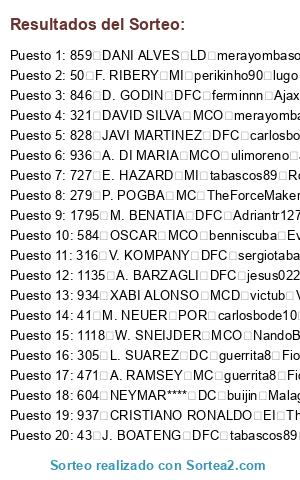 Lista de participantes: 41 M. NEUER POR carlosbode10 Ath. Bilbao, 43 J. BOATENG DFC tabascos89 Roma, 45 P. LAHM MCD TheForceMaker Alcorcon, 47 B. SCHWEINSTEIGER MC TheForceMaker Alcorcon, 48 A. ROBBEN MD guerrita8 Fiorentina, 49 T. MULLER MD ulimoreno Juventus, 50 F. RIBERY MI perikinho90 lugo, 51 M. GOMEZ DC Red Dutti Granada, 62 M. HUMMELS DFC Xsamu Manchester United, 66 GOTZE MCO guerrita8 Fiorentina, 74 R. LEWANDOWSKI DC adrylito Malaga, 79 M. REUS MI NandoBel78 Leganes, 112 J. FARFAN MD perikinho90 lugo, 114 K. HUNTELAAR DC carlosbode10 Ath. Bilbao, 145 M. MANDZUKIC DC igosling Barcelona, 244 P. CECH POR merayombasogo Boca Juniors, 247 J. TERRY DFC MaDaScAs Ac Milan, 252 D. STURRIDGE DC alemalaga94 benfica, 254 MATA MCO KaOs I AsTuR Tottenham, 256 DAVID LUIZ DFC sergiotabascos89 Real Madrid, 262 ALEX DFC alead71 Villarreal, 279 P. POGBA MC TheForceMaker Alcorcon, 301 S. GERRARD MCD Xsamu Manchester United, 305 L. SUAREZ DC guerrita8 Fiorentina, 316 V. KOMPANY DFC sergiotabascos89 Real Madrid, 319 Y. TOURE MC pinolines Celtic, 321 DAVID SILVA MCO merayombasogo Boca Juniors, 322 S. NASRI MI lorenbb Betis, 323 S. AGÜERO DC perikinho90 Lugo, 324 C. TEVEZ DC x chachiquesi x Cordoba, 329 E. DZEKO DC MaDaScAs Ac Milan, 340 N. VIDIC DFC SSpecializeDD Manchester City, 346 W. ROONEY DC Saavexbox Las Palmas, 381 DIEGO COSTA**** DC Cruz8 Southend United, 414 L. MODRIC MC adrylito Malaga, 415 G. BALE MD ggio92 B. Leverkusen, 467 P. MERTESACKER DFC Saavexbox Las Palmas, 471 A. RAMSEY MC guerrita8 Fiorentina, 474 R. VAN PERSIE DC merayombasogo Boca Juniors, 584 OSCAR MCO benniscuba Everton, 604 NEYMAR**** DC buijin Malaga, 609 LUCAS ED Demente MC Sevilla, 727 E. HAZARD MI tabascos89 Roma, 754 H. LLORIS POR ferminnn Ajax, 828 JAVI MARTINEZ DFC carlosbode10 Ath. Bilbao, 844 FALCAO DC perikinho90 Lugo, 846 D. GODIN DFC ferminnn Ajax, 859 DANI ALVES LD merayombasogo Boca Juniors, 861 PIQUE DFC MrMohamRam Espanyol, 863 SERGIO BUSQUETS MCD Crivi Llagostera, 864 XAVI MC tabascos89 Roma, 865 CESC FABREGAS MC lorenbb Betis, 866 INIESTA MC merayombasogo Boca Juniors, 867 L. MESSI MP adrylito Malaga, 870 J. MASCHERANO MCD perikinho90 Lugo, 871 A. SANCHEZ ED sergiotabascos89 Real Madrid, 873 PEDRO EI Cometheaven Elche, 897 J. TOULALAN MCD Yelko100 B. Dortmund, 900 SANTI CAZORLA MI MrMohamRam Espanyol, 906 ISCO MCO misterserpico Sounders, 929 CASILLAS POR sergiotabascos89 Real Madrid, 930 SERGIO RAMOS DFC guerrita8 Fiorentina, 931 PEPE DFC carlosbode10 Ath. Bilbao, 934 XABI ALONSO MCD victub Valencia, 936 A. DI MARIA MCO ulimoreno Juventus, 937 CRISTIANO RONALDO EI TheForceMaker Alcorcon, 938 M. OZIL MCO misterserpico Sounders, 939 K. BENZEMA DC Saavexbox Las Palmas, 943 G. HIGUAIN DC alemalaga94 Benfica, 944 S. KHEDIRA MCD guerrita8 Fiorentina, 971 JESUS NAVAS MD MrMohamRam Espanyol, 976 A. NEGREDO DC javitr Racing Santander, 979 I. RAKITIC MCO TATO XD Depor, 1028 THIAGO SILVA DFC ferminnn Ajax, 1035 Z. IBRAHIMOVIC DC crivi Llagostera, 1075 A. CANDREVA ED javitr Racing Santander, 1118 W. SNEIJDER MCO NandoBel78 Leganes, 1122 T. MOTTA MCD SSpecializeDD Manchester City, 1135 A. BARZAGLI DFC jesus022 Villarreal, 1136 G. CHIELLINI DFC perikinho90 Lugo, 1138 A. VIDAL MC alemalaga94 benfica, 1184 E. LAVEZZI EI alemalaga94 benfica, 1185 E. CAVANI DC victub Valencia, 1217 M. PJANIC MC Havel7 Inter de Milan, 1254 JOAO MOUTINHO MC NandoBel78 Leganes, 1255 HULK ED NandoBel78 Leganes, 1259 JAMES RODRIGUEZ MCO victub Valencia, 1277 E. GARAY DFC Saavexbox Las Palmas, 1426 J. CUADRADO MD ulimoreno Juventus, 1724 DE ROSSI MCD adrylito Malaga, 1729 PIRLO MC Demente MC Sevilla, 1730 ERIKSEN MI lorenbb Betis, 1744 HAMSIK MCO Havel7 Inter de Milan, 1753 KROOS MC javitr Racing Santander, 1757 GUNDOGAN MC danygp89 Chelsea, 1766 MARCHISIO MC perikinho90 Lugo, 1784 T. COURTOIS POR Adriantr127 Arsenal, 1795 M. BENATIA DFC Adriantr127 Arsenal, 1796 MIRANDA DFC igosling Barcelona, 1797 MATUIDI MCD igosling Barcelona.