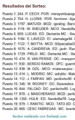 Lista de participantes: 41 M. NEUER POR carlosbode10 Ath. Bilbao, 43 J. BOATENG DFC tabascos89 Roma, 45 P. LAHM MCD TheForceMaker Alcorcon, 47 B. SCHWEINSTEIGER MC TheForceMaker Alcorcon, 48 A. ROBBEN MD guerrita8 Fiorentina, 49 T. MULLER MD ulimoreno Juventus, 50 F. RIBERY MI perikinho90 lugo, 51 M. GOMEZ DC Red Dutti Granada, 62 M. HUMMELS DFC Xsamu Manchester United, 66 GOTZE MCO guerrita8 Fiorentina, 74 R. LEWANDOWSKI DC adrylito Malaga, 79 M. REUS MI NandoBel78 Leganes, 112 J. FARFAN MD perikinho90 lugo, 114 K. HUNTELAAR DC carlosbode10 Ath. Bilbao, 145 M. MANDZUKIC DC igosling Barcelona, 244 P. CECH POR merayombasogo Boca Juniors, 247 J. TERRY DFC MaDaScAs Ac Milan, 252 D. STURRIDGE DC alemalaga94 benfica, 254 MATA MCO KaOs I AsTuR Tottenham, 256 DAVID LUIZ DFC sergiotabascos89 Real Madrid, 262 ALEX DFC alead71 Villarreal, 279 P. POGBA MC TheForceMaker Alcorcon, 301 S. GERRARD MCD Xsamu Manchester United, 305 L. SUAREZ DC guerrita8 Fiorentina, 316 V. KOMPANY DFC sergiotabascos89 Real Madrid, 319 Y. TOURE MC pinolines Celtic, 321 DAVID SILVA MCO merayombasogo Boca Juniors, 322 S. NASRI MI lorenbb Betis, 323 S. AGÜERO DC perikinho90 Lugo, 324 C. TEVEZ DC x chachiquesi x Cordoba, 329 E. DZEKO DC MaDaScAs Ac Milan, 340 N. VIDIC DFC SSpecializeDD Manchester City, 346 W. ROONEY DC Saavexbox Las Palmas, 381 DIEGO COSTA**** DC Cruz8 Southend United, 414 L. MODRIC MC adrylito Malaga, 415 G. BALE MD ggio92 B. Leverkusen, 467 P. MERTESACKER DFC Saavexbox Las Palmas, 471 A. RAMSEY MC guerrita8 Fiorentina, 474 R. VAN PERSIE DC merayombasogo Boca Juniors, 584 OSCAR MCO benniscuba Everton, 604 NEYMAR**** DC buijin Malaga, 609 LUCAS ED Demente MC Sevilla, 727 E. HAZARD MI tabascos89 Roma, 754 H. LLORIS POR ferminnn Ajax, 828 JAVI MARTINEZ DFC carlosbode10 Ath. Bilbao, 844 FALCAO DC perikinho90 Lugo, 846 D. GODIN DFC ferminnn Ajax, 859 DANI ALVES LD merayombasogo Boca Juniors, 861 PIQUE DFC MrMohamRam Espanyol, 863 SERGIO BUSQUETS MCD Crivi Llagostera, 864 XAVI MC tabascos89 Roma, 865 CESC FABREGAS MC lorenbb Betis, 866 INIESTA MC merayombasogo Boca Juniors, 867 L. MESSI MP adrylito Malaga, 870 J. MASCHERANO MCD perikinho90 Lugo, 871 A. SANCHEZ ED sergiotabascos89 Real Madrid, 873 PEDRO EI Cometheaven Elche, 897 J. TOULALAN MCD Yelko100 B. Dortmund, 900 SANTI CAZORLA MI MrMohamRam Espanyol, 906 ISCO MCO misterserpico Sounders, 929 CASILLAS POR sergiotabascos89 Real Madrid, 930 SERGIO RAMOS DFC guerrita8 Fiorentina, 931 PEPE DFC carlosbode10 Ath. Bilbao, 934 XABI ALONSO MCD victub Valencia, 936 A. DI MARIA MCO ulimoreno Juventus, 937 CRISTIANO RONALDO EI TheForceMaker Alcorcon, 938 M. OZIL MCO misterserpico Sounders, 939 K. BENZEMA DC Saavexbox Las Palmas, 943 G. HIGUAIN DC alemalaga94 Benfica, 944 S. KHEDIRA MCD guerrita8 Fiorentina, 971 JESUS NAVAS MD MrMohamRam Espanyol, 976 A. NEGREDO DC javitr Racing Santander, 979 I. RAKITIC MCO TATO XD Depor, 1028 THIAGO SILVA DFC ferminnn Ajax, 1035 Z. IBRAHIMOVIC DC crivi Llagostera, 1075 A. CANDREVA ED javitr Racing Santander, 1118 W. SNEIJDER MCO NandoBel78 Leganes, 1122 T. MOTTA MCD SSpecializeDD Manchester City, 1135 A. BARZAGLI DFC jesus022 Villarreal, 1136 G. CHIELLINI DFC perikinho90 Lugo, 1138 A. VIDAL MC alemalaga94 benfica, 1184 E. LAVEZZI EI alemalaga94 benfica, 1185 E. CAVANI DC victub Valencia, 1217 M. PJANIC MC Havel7 Inter de Milan, 1254 JOAO MOUTINHO MC NandoBel78 Leganes, 1255 HULK ED NandoBel78 Leganes, 1259 JAMES RODRIGUEZ MCO victub Valencia, 1277 E. GARAY DFC Saavexbox Las Palmas, 1426 J. CUADRADO MD ulimoreno Juventus, 1724 DE ROSSI MCD adrylito Malaga, 1729 PIRLO MC Demente MC Sevilla, 1730 ERIKSEN MI lorenbb Betis, 1744 HAMSIK MCO Havel7 Inter de Milan, 1753 KROOS MC javitr Racing Santander, 1757 GUNDOGAN MC danygp89 Chelsea, 1766 MARCHISIO MC perikinho90 Lugo, 1784 T. COURTOIS POR Adriantr127 Arsenal, 1795 M. BENATIA DFC Adriantr127 Arsenal, 1796 MIRANDA DFC igosling Barcelona, 1797 MATUIDI MCD igosling Barcelona.