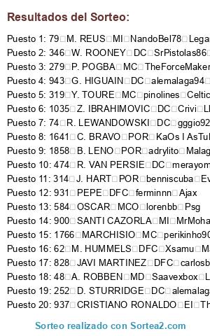 Lista de participantes: 41 M. NEUER POR carlosbode10 Ath. Bilbao, 43 J. BOATENG DFC tabascos89 Roma, 45 P. LAHM MCD TheForceMaker Alcorcon, 47 B. SCHWEINSTEIGER MC TheForceMaker Alcorcon, 48 A. ROBBEN MD Saavexbox Las Palmas, 49 T. MULLER MD ulimoreno Juventus, 50 F. RIBERY MI perikinho90 Lugo, 57 D. ALABA LI tabascos89 Roma, 62 M. HUMMELS DFC Xsamu Manchester United, 66 M. GOTZE MCO angelitotabasco Fiorentina, 74 R. LEWANDOWSKI DC gggio92 Eibar, 79 M. REUS MI NandoBel78 Leganes, 112 J. FARFAN MD perikinho90 Lugo, 114 K. HUNTELAAR DC carlosbode10 Ath. Bilbao, 145 M. MANDZUKIC DC iGosling v9 Barcelona, 178 F. MUSLERA POR sergiord14 Southend United, 244 P. CECH POR merayombasogo Boca Juniors, 252 D. STURRIDGE DC alemalaga94 Benfica, 254 MATA MCO SIN GAMER SIN EQUIPO, 256 DAVID LUIZ DFC sergiotabascos89 Real Madrid, 279 P. POGBA MC TheForceMaker Alcorcon, 305 L. SUAREZ DC adrylito malaga, 314 J. HART POR benniscuba Everton, 316 V. KOMPANY DFC sergiotabascos89 Real Madrid, 319 Y. TOURE MC pinolines Celtic, 321 DAVID SILVA MCO merayombasogo Boca Juniors, 322 S. NASRI MI gggio92 Eibar, 323 S. AGÜERO DC perikinho90 Lugo, 324 C. TEVEZ DC x chachiquesi x Cordoba, 329 E. DZEKO DC sergiotabascos89 Real Madrid, 332 P. ZABALETA LD Platero17 Sevilla, 337 DE GEA POR MrMohamRam Espanyol, 346 W. ROONEY DC SrPistolas86 Rayo Vallecano, 414 L. MODRIC MC adrylito Malaga, 415 G. BALE MD angelitotabasco Fiorentina, 474 R. VAN PERSIE DC merayombasogo Boca Juniors, 584 OSCAR MCO lorenbb Psg, 604 NEYMAR DC sergiord14 Southend United, 727 E. HAZARD MI tabascos89 Roma, 754 H. LLORIS POR MaDaScAs Ac Milan, 784 S. RUFFIER POR ulimoreno Juventus, 828 JAVI MARTINEZ DFC carlosbode10 Ath. Bilbao, 844 FALCAO DC perikinho90 Lugo, 845 A. TURAN MI Yelko100 B. Dortmund, 846 D. GODIN DFC carlosbode10 Ath. Bilbao, 853 DIEGO COSTA DC buijin Atco. Madrid, 859 DANI ALVES LD merayombasogo Boca Juniors, 861 PIQUE DFC MrMohamRam Espanyol, 863 SERGIO BUSQUETS MCD Crivi Llagostera, 864 XAVI MC tabascos89 Roma, 865 CESC FABREGAS MC benniscuba Everton, 866 INIESTA MC merayombasogo Boca Juniors, 867 L. MESSI MP adrylito Malaga, 870 J. MASCHERANO MCD perikinho90 Lugo, 871 A. SANCHEZ ED sergiotabascos89 Real Madrid, 873 PEDRO EI CometHeaven79 Elche, 900 SANTI CAZORLA MI MrMohamRam Espanyol, 906 ISCO MCO misterserpico Sounders, 929 CASILLAS POR sergiotabascos89 Real Madrid, 930 SERGIO RAMOS DFC alemalaga94 benfica, 931 PEPE DFC ferminnn Ajax, 934 XABI ALONSO MCD victub Valencia, 936 A. DI MARIA MCO ulimoreno Juventus, 937 CRISTIANO RONALDO EI TheForceMaker Alcorcon, 938 M. OZIL MCO angelitotabasco Fiorentina, 939 K. BENZEMA DC Saavexbox Las Palmas, 943 G. HIGUAIN DC alemalaga94 benfica, 944 S. KHEDIRA MCD angelitotabasco Fiorentina, 976 A. NEGREDO DC Balles Shacktar Donest, 979 I. RAKITIC MCO TATO XD Depor, 1028 THIAGO SILVA DFC ferminnn Ajax, 1035 Z. IBRAHIMOVIC DC Crivi Llagostera, 1075 A. CANDREVA ED benniscuba Everton, 1118 W. SNEIJDER MCO NandoBel78 Leganes, 1135 A. BARZAGLI DFC alead71 Villarreal, 1136 G. CHIELLINI DFC perikinho90 Lugo, 1138 A. VIDAL MC angelitotabasco Fiorentina, 1185 E. CAVANI DC victub Valencia, 1217 M. PJANIC MC Havel7 Inter de Milan, 1230 S. HANDANOVIC POR ferminnn Ajax, 1251 N. OTAMENDI DFC victub Valencia, 1254 JOAO MOUTINHO MC NandoBel78 Leganes, 1255 HULK ED SIN GAMER SIN EQUIPO, 1259 JAMES RODRIGUEZ MCO victub Valencia, 1277 E. GARAY DFC buijin Atco. Madrid, 1331 K. DE BRUYNE MCO alexfcbarcelona Recreativo, 1610 N. MATIC MCD CometHeaven79 Elche, 1641 C. BRAVO POR KaOs I AsTuR Tottenham, 1662 SIRIGU POR danygp89 Chelsea, 1753 T. KROOS MC javitr Racing Santander, 1755 C. VELA ED javitr Racing Santander, 1757 GUNDOGAN MC danygp89 Chelsea, 1766 MARCHISIO MC perikinho90 Lugo, 1784 T. COURTOIS POR Adriantr127 Arsenal, 1795 M. BENATIA DFC Adriantr127 Arsenal, 1796 MIRANDA DFC iGosling v9 Barcelona, 1797 MATUIDI MCD iGosling v9 Barcelona, 1822 M. VERRATI MC alemalaga94 Benfica, 1858 B. LENO POR adrylito Malaga.