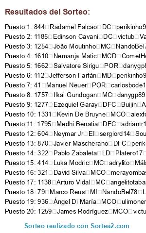 Lista de participantes: 867 Lionel Messi MP adrylito Málaga, 937 Cristiano Ronaldo EI TheForceMaker Alcorcón, 41 Manuel Neuer POR carlosbode10 Ath. Bilbao, 1035 Zlatan Ibrahimovic DC crivi Llagostera, 48 Arjen Robben MD Saavexbox Las Palmas, 305 Luis Suárez DC adrylito Málaga, 866 Andrés Iniesta MC merayombasogo Boca Juniors, 727 Eden Hazard MI tabascos89 Roma, 50 Franck Ribéry MI perikinho90 Lugo, 47 Bastian Schweinsteiger MC TheForceMaker Alcorcón, 74 Robert Lewandowski DC ggio92 Leverkusen, 414 Luka Modric MC adrylito Málaga, 415 Gareth Bale MD angelitotabasco Fiorentina, 321 David Silva MCO merayombasogo Boca Juniors, 1028 Thiago Silva DFC ferminnn Ajax, 930 Sergio Ramos DFC alemalaga94 Benfica, 323 Sergio Agüero DC perikinho90 Lugo, 45 Philip Lahm MCD TheForceMaker Alcorcón, 474 Robin Van Persie DC merayombasogo Boca Juniors, 1259 James Rodríguez MCO victub Valencia, 66 Mario Götze MCO angelitotabasco Fiorentina, 1784 Thibaut Courtois POR adriantr127 Arsenal, 604 Neymar Jr EI sergiord14 Southend United, 49 Thomas Müller MD ulimonero Juventus, 79 Marco Reus MI NandoBel78 Leganes, 43 Jerome Boateng DFC tabascos89 Roma, 936 Ángel Di María MCO ulimonero Juventus, 62 Matts Hummels DFC xSAMU Manchester United, 938 Mesut Özil MCO misterserpico Sounders, 844 Radamel Falcao DC perikinho90 Lugo, 316 Vicent Kompany DFC sergiotabascos89 Real Madrid, 346 Wayne Rooney DC SrPistolas86 Rayo Vallecano, 319 Yaya Touré MC pinolines Celtic, 864 Xavi Hernandez MC tabascos89 Roma, 337 David De Gea POR MrMohamRam Espanyol, 863 Sergio Busquets MCD crivi Llagostera, 871 Alexis Sánchez ED sergiotabascos89 Real Madrid, 1753 Toni Kroos MC javitr Racing Santander, 1138 Arturo Vidal MC angelitotabasco Fiorentina, 853 Diego Costa DC Buijin Atl. Madrid, 1185 Edinson Cavani DC victub Valencia, Juan Mata MCO, 828 Javi Martínez DFC carlosbode10 Ath. Bilbao, 754 Hugo Lloris POR MaDaScAs AC Milan, 939 Karim Benzema DC Saavexbox Las Palmas, 865 Ces Fàbregas MC benniscuba Everton, 900 Santi Cazorla MCO MrMohamRam Espanyol, 324 Carlos Tévez DC x chachiquesi x Córdoba, 244 Petr Cech POR merayombasogo Boca Juniors, 934 Xabi Alonso MCD victub Valencia, 279 Paul Pogba MC TheForceMaker Alcorcón, 1331 Kevin De Bruyne MCO alexfcbarcelona Recreativo, 584 Oscar MCO lorenbb PSG, 846 Diego Godín DFC carlosbode10 Ath. Bilbao, 944 Sami Khedira MCD angelitotabasco Fiorentina, 1795 Medhi Benatia DFC adriantr127 Arsenal, 943 Gonzalo Higuaín DC alemalaga94 Benfica, 322 Samir Nasri MI ggio92 Leverkusen, 1230 Samir Handanovic POR ferminnn Ajax, 861 Gerard Piqué DFC MrMohamRam Espanyol, 114 Klaas-Jan Huntelaar DC carlosbode10 Ath. Bilbao, 845 Arda Turan MI Yelko100 Borussia Dortmund, 1118 Wesley Sneijder MCO NandoBel78 Leganes, 1136 Giorgio Chiellini DFC perikinho90 Lugo, 1724 Daniele De Rossi MCD MrMohamRam Espanyol, 929 Iker Casillas POR sergiotabascos89 Real Madrid, 906 Isco Alarcón MCO misterserpico Sounders, 57 David Alaba LI tabascos89 Roma, 1732 Jackson Martínez DC MrMohamRam Espanyol, 1610 Nemanja Matic MCD CometHeaven79 Elche, 873 Pedro Rodríguez EI CometHeaven79 Elche, Hulk ED, 67 Kagawa MCO SrPistolas86 Rayo Vallecano, 1757 Ilkai Gündogan MC danygp89 Chelsea, 178 Fernando Muslera POR sergiord14 Southend United, 145 Mario Mandzukic DC iGosling v9 FC Barcelona, 329 Edin Dzeko DC sergiotabascos89 Real Madrid, 1217 Miralem Pjanic MC Havel7 Inter de Milan, 1641 Claudio Bravo POR KaOs I AsTuR Tottenham, 1075 Antonio Candreva ED benniscuba Everton, 1766 Claudio Marchisio MC perikinho90 Lugo, 252 Daniel Sturridge DC alemalaga94 Benfica, 1797 Blaise Matuidi MCD iGosling v9 FC Barcelona, 1277 Ezequiel Garay DFC Buijin Atl. Madrid, 1755 Carlos Vela ED javitr Racing Santander, 979 Ivan Rakitic MCO TATO XD Depor, 1796 João Miranda DFC iGosling v9 FC Barcelona, 1662 Salvatore Sirigu POR danygp89 Chelsea, 784 Stéphane Ruffier POR ulimonero Juventus, 1254 João Moutinho MC NandoBel78 Leganes, 112 Jefferson Farfán MD perikinho90 Lugo, 314 Joe Hart POR benniscuba Everton, 859 Dani Alves LD merayombasogo Boca Juniors, 976 Álvaro Negredo DC BaIIes Shakhtar Donekts, 322 Pablo Zabaleta LD Platero17 Sevilla, 870 Javier Mascherano DFC perikinho90 Lugo, 340 Nemanja Vidic DFC SSpecializeDD Manchester City, 1135 Andrea Barzagli DFC alead71 Villarreal, 931 Pepe DFC ferminnn Ajax, 897 Jeremy Toulalán MCD xSAMU Manchester United.