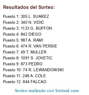 Lista de participantes: 1035 IBRAHIMOVIC, 937 C. RONALDO, 1028 THIAGO SILVA, 45 LAHM, 867 L. MESSI, 50 F. RIBERY, 844 FALCAO, 866 INIESTA, 864 XAVI, 474 R. VAN PERSIE, 48 A. ROBBEN, 47 B. SCHWEINSTEIGER, 340 N. VIDIC, 321 DAVID SILVA, 323 S. AGÜERO, 346 W. ROONEY, 1185 E. CAVANI, 938 M. OZIL, 415 G. BALE, 254 MATA, 41 M. NEUER, 936 A. DI MARIA, 316 V. KOMPANY, 324 C. TEVEZ, 1729 PIRLO, 861 PIQUE, 305 L. SUAREZ, 51 M. GOMEZ, 1136 G. CHIELLINI, 930 SERGIO RAMOS, 865 CESC FABREGAS, 319 Y. TOURE, 1133 G. BUFFON, 929 CASILLAS, 74 R. LEWANDOWSKI, 62 M. HUMMELS, 1184 E. LAVEZZI, 1138 A. VIDAL, 971 JESUS NAVAS, 900 SANTI CAZORLA, 66 M. GOTZE, 934 XABI ALONSO, 871 A. SANCHEZ, 727 E. HAZARD, 414 L.MODRIC, 49 T. MULLER, 939 K. BENZEMA, 863 SERGIO BUSQUETS, 248 A. COLE, 79 M. REUS, 873 PEDRO, 842 DIEGO, 1753 KROOS, 1255 HULK, 1238 A. DI NATALE, 1757 GUNDOGAN, 1087 R. MONTOLIVO, 944 S. KHEDIRA, 943 G. HIGUAIN, 870 J. MASCHERANO, 845 A. TURAN, 626 S. ETO´O, 604 NEYMAR, 342 NANI, 322 S. NASRI, 1766 MARCHISIO, 1744 HAMSIK, 1724 DE ROSSI, 1135 A. BARZAGLI, 1118 W. SNEIJDER, 1091 S. JOVETIC, 995 SOLDADO, 987 A. RAMI, 859 DANI ALVES, 828 JAVI MARTINEZ, 114 K. HUNTELAAR, 1784 T. COURTOIS, 1647 F. MARCHETTI, 1230 S. HANDANOVIC, 906 ISCO, 754 H. LLORIS, 640 I. AKINFEEV, 314 J. HART, 244 P. CECH, 78 DANTE, 25 R. ADLER, 253 D. DROGBA, 301 S. GERRARD, 1165 HERNANES, 416 R. VAN DER VAART, 356 A. VALENCIA, 339 R. FERDINAND, 67 S. KAGAWA, 1840 WILLIAN, 1722 DIAMANTI, 1254 JOAO MOUTINHO, 940 KAKA, 931 PEPE, 868 DAVID VILLA, 853 DIEGO COSTA, 470 A. SONG, 329 E. DZEKO, 73 J. BLASZCZYKOWSKI.