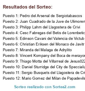 Lista de participantes: Steven Gerrard del Rayo de Charlylopezrey, Mario Gomez del Milan de Papadevils, Alex del Villarreal de Jesus022, Eduardo Lavezzi del Boca de Merayonbasogo, Thiago Motta del Villarreal de Jesus022, David Luiz del Arsenal de Sergiotabascos, Lucas del R. Madrid de Nandobel, Antonio Candreva del Boca de Merayonbasogo, Claudio Marchisio de la Juve de Ulimoreno, Marek Hamsik del Inter de Havel, Andrea Barzagli de la Juve de Ulimoreno, Nemanja Vidic del City de Specializedd, Hulk de la Roma de Alemalaga, Per Mertesacker del Rayo de Charlyperezrey, John Terry del Napoles de Seal Kapo, Jefferson Farfan del Schalke de Mistersepico, Daniel Sturridge del City de Speccializedd, Edwin Dzeko del Titan de MrMohamRam, Negredo del Villarreal de Jesus022, Jesus Navas del Titan de MrMohamRam, Ilkay Gundogan del Alcorcon de TheForceMaker, Christian Eriksen del Monaco de Javitr, Aaron Ramsey del R. Madrid de Nandobel, Isco del Villarreal de Jesus022, Pedro del Arsenal de Sergiotabascos, Mario Mandzukic del Villareal de Jesus022, Ivan Rakitic del Toledo de Tabascos, Blaise Matuidi de los Yebenes de Adriantr, Miranda del Malaga de Adrylito, Ezekiel Garay del Villarreal de Jesus022, Joao Moutinho del R. Madrid de Nandobel, Dani Alves del Toledo de Tabascos, Javier Mascherano del Betas de Perikinho, Jeremy Toulalan del Rayo de Charlyperezrey, Pepe del Ath. Bilbao de Carlosbode, Paul Pogba del Vitesse de Jesub, Juan Cuadrado de la Juve de Ulimoreno, Miralem Pjanic del Inter de Havel, Gonzalo Higuain del Nacional de Adizero1drose, Klaas-Jan Huntelaar del Ath. Bilbao de Carlosbode, Danniele de Rossi del Malaga de Adrylito, Wesley Sneijder de la Roma de Alemalaga, Oscar del Murcia de Rikel, Alexis Sanchez del Bayern de Marcoss1, Samir Nasri de las Palmas de Saavexbox, Santi Cazorla del Schalke de Misterserpico, Mehdi Benatia de los Yebenes de Adriantr, Diego Godin del Swansea de Fermin, Sami Khedira del Titan de MrMohamRam, Gerard Pique del Titan de MrMohamRam, Giorgio Chiellini de las Palmas de Saavexbox, Andrea Pirlo del Bayern de Marcoss1, Xabi Alonso del Valencia de Victub, Iker Casillas del Arsenal de Sergiotabascos, Cesc Fabregas del Betis de Lorenbetico, Hugo Lloris del Monaco de Javitr, Javi Martinez del Ath. Bilbao de Carlosbode, Sergio Busquets del Llagostera de Crivi, Jerome Boateng del Toledo de Tabascos, Juan Mata del Boca de Merayonbasogo, Karim Benzema de las Palmas de Saavexbox, Carlos Tevez - Juventus 85, Mario Götze del Murcia de Rikel, Diego Costa del Atco. Madrid de Ivaan, Toni Kroos del Betis de Lorenbetico, Arturo Vidal del Leverkusen de Cudeiro, Petr Cech de las Palmas de Saavexbox, Edinson Cavani del Valencia de Victub, James Rodríguez del Valencia de Victub, Thibaut Courtois de los Yebenes de Adriantr, Neymar del Dortmund de Cruz, Mats Hummels del Bayern de Marcoss1, Mesut Ozil del Celtic de ManuKm, Thomas Muller de la Juve de Ulimoreno, Marco Reus del Real Madrid de Nandobel, Angel Di Maria de la Juve de Ulimoreno, Sergio Aguero del Betas de Perikinho, Wayne Rooney del Flamengo de Chachiquesi, Yaya Toure del Celtic de ManuKm, Xavi del Chelsea de Escrich, Vincent Kompany del Boca de merayonbasoyo, Robert Lewandowski del Malaga de Adrylito, Luka Modric del Malaga de Adrylito, David Silva del Valencia de Victub, Thiago Silva del Swansea de Fermin, Sergio Ramos del Murcia de Rikel, Gareth Bale del Leverkusen de Cudeiro, Philipp Lahm del Llagostera de Crivi, Radamel Falcao del Betas de Perikinho, Robin van Persie del Flamengo de Chachiquesi, Eden Hazard del Toledo de Tabascos, Franck Ribéry del Napoles de Seal Kapo, Bastian Schweinsteiger del Betis de Lorenbetico, Luis Suárez del Murcia de Rikel, Andrés Iniesta del Betas de Perikinho, Manuel Neuer del Ath. Bilbao de Carlosbode, Zlatan Ibrahimovic del Malaga de Adrylito, Arjen Robben del Bayern de Marcoss1, Cristiano Ronaldo del Alcorcon de TheForceMaker, Lionei Messi del Llagostera de Crivi.
