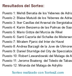 Lista de participantes: Steven Gerrard del Rayo de Charlylopezrey, Mario Gomez del Milan de Papadevils, Alex del Villarreal de Jesus022, Eduardo Lavezzi del Boca de Merayonbasogo, Thiago Motta del Villarreal de Jesus022, David Luiz del Arsenal de Sergiotabascos, Lucas del R. Madrid de Nandobel, Antonio Candreva del Boca de Merayonbasogo, Claudio Marchisio de la Juve de Ulimoreno, Marek Hamsik del Inter de Havel, Andrea Barzagli de la Juve de Ulimoreno, Nemanja Vidic del City de Specializedd, Hulk de la Roma de Alemalaga, Per Mertesacker del Rayo de Charlyperezrey, John Terry del Napoles de Seal Kapo, Jefferson Farfan del Schalke de Mistersepico, Daniel Sturridge del City de Speccializedd, Edwin Dzeko del Titan de MrMohamRam, Negredo del Villarreal de Jesus022, Jesus Navas del Titan de MrMohamRam, Ilkay Gundogan del Alcorcon de TheForceMaker, Christian Eriksen del Monaco de Javitr, Aaron Ramsey del R. Madrid de Nandobel, Isco del Villarreal de Jesus022, Pedro del Arsenal de Sergiotabascos, Mario Mandzukic del Villareal de Jesus022, Ivan Rakitic del Toledo de Tabascos, Blaise Matuidi de los Yebenes de Adriantr, Miranda del Malaga de Adrylito, Ezekiel Garay del Villarreal de Jesus022, Joao Moutinho del R. Madrid de Nandobel, Dani Alves del Toledo de Tabascos, Javier Mascherano del Betas de Perikinho, Jeremy Toulalan del Rayo de Charlyperezrey, Pepe del Ath. Bilbao de Carlosbode, Paul Pogba del Vitesse de Jesub, Juan Cuadrado de la Juve de Ulimoreno, Miralem Pjanic del Inter de Havel, Gonzalo Higuain del Nacional de Adizero1drose, Klaas-Jan Huntelaar del Ath. Bilbao de Carlosbode, Danniele de Rossi del Malaga de Adrylito, Wesley Sneijder de la Roma de Alemalaga, Oscar del Murcia de Rikel, Alexis Sanchez del Bayern de Marcoss1, Samir Nasri de las Palmas de Saavexbox, Santi Cazorla del Schalke de Misterserpico, Mehdi Benatia de los Yebenes de Adriantr, Diego Godin del Swansea de Fermin, Sami Khedira del Titan de MrMohamRam, Gerard Pique del Titan de MrMohamRam, Giorgio Chiellini de las Palmas de Saavexbox, Andrea Pirlo del Bayern de Marcoss1, Xabi Alonso del Valencia de Victub, Iker Casillas del Arsenal de Sergiotabascos, Cesc Fabregas del Betis de Lorenbetico, Hugo Lloris del Monaco de Javitr, Javi Martinez del Ath. Bilbao de Carlosbode, Sergio Busquets del Llagostera de Crivi, Jerome Boateng del Toledo de Tabascos, Juan Mata del Boca de Merayonbasogo, Karim Benzema de las Palmas de Saavexbox, Carlos Tevez - Juventus 85, Mario Götze del Murcia de Rikel, Diego Costa del Atco. Madrid de Ivaan, Toni Kroos del Betis de Lorenbetico, Arturo Vidal del Leverkusen de Cudeiro, Petr Cech de las Palmas de Saavexbox, Edinson Cavani del Valencia de Victub, James Rodríguez del Valencia de Victub, Thibaut Courtois de los Yebenes de Adriantr, Neymar del Dortmund de Cruz, Mats Hummels del Bayern de Marcoss1, Mesut Ozil del Celtic de ManuKm, Thomas Muller de la Juve de Ulimoreno, Marco Reus del Real Madrid de Nandobel, Angel Di Maria de la Juve de Ulimoreno, Sergio Aguero del Betas de Perikinho, Wayne Rooney del Flamengo de Chachiquesi, Yaya Toure del Celtic de ManuKm, Xavi del Chelsea de Escrich, Vincent Kompany del Boca de merayonbasoyo, Robert Lewandowski del Malaga de Adrylito, Luka Modric del Malaga de Adrylito, David Silva del Valencia de Victub, Thiago Silva del Swansea de Fermin, Sergio Ramos del Murcia de Rikel, Gareth Bale del Leverkusen de Cudeiro, Philipp Lahm del Llagostera de Crivi, Radamel Falcao del Betas de Perikinho, Robin van Persie del Flamengo de Chachiquesi, Eden Hazard del Toledo de Tabascos, Franck Ribéry del Napoles de Seal Kapo, Bastian Schweinsteiger del Betis de Lorenbetico, Luis Suárez del Murcia de Rikel, Andrés Iniesta del Betas de Perikinho, Manuel Neuer del Ath. Bilbao de Carlosbode, Zlatan Ibrahimovic del Malaga de Adrylito, Arjen Robben del Bayern de Marcoss1, Cristiano Ronaldo del Alcorcon de TheForceMaker, Lionei Messi del Llagostera de Crivi.