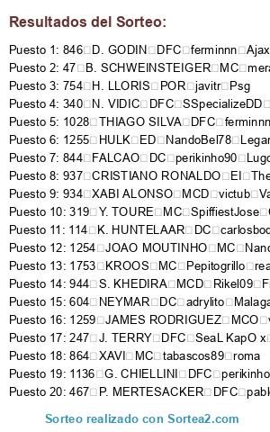 Lista de participantes: 41 M. NEUER POR carlosbode10 Ath. Bilbao, 43 J. BOATENG DFC tabascos89 Roma, 45 P. LAHM MCD Crivi Llagostera, 47 B. SCHWEINSTEIGER MC merayombasogo Boca Juniors, 48 A. ROBBEN MD Rikel09 Fiorentina, 49 T. MULLER MD ulimoreno Juventus, 50 F. RIBERY MI cometheaven79 elche, 51 M. GOMEZ DC javitr psg, 62 M. HUMMELS DFC Xsamu Manchester United, 66 M. GOTZE MCO misterserpico Sounders, 74 R. LEWANDOWSKI DC cruz88 Southend United, 79 M. REUS MI NandoBel78 Leganes, 112 J. FARFAN MD Pepitogrillo real Sociedad, 114 K. HUNTELAAR DC carlosbode10 Ath. Bilbao, 145 M. MANDZUKIC DC Red Dutti Granada, 244 P. CECH POR Havel7 Inter de Milan, 247 J. TERRY DFC SeaL KapO x Napoles, 252 D. STURRIDGE DC alemalaga94 Benfica, 254 MATA MCO angelitotabasco tottenham, 256 DAVID LUIZ DFC sergiotabascos89 Real Madrid, 262 ALEX DFC jesus022 Villarreal, 279 P. POGBA MC TheForceMaker Alcorcon, 301 S. GERRARD MCD jesusb Monaco, 305 L. SUAREZ DC Rikel09 Fiorentina, 316 V. KOMPANY DFC merayombasogo Boca Juniors, 319 Y. TOURE MC SpiffiestJose Celtic, 321 DAVID SILVA MCO iGosling v9 fcbarcelona, 322 S. NASRI MI Samue91 Betis, 323 S. AGÜERO DC perikinho90 Lugo, 324 C. TEVEZ DC x chachiquesi x Cordoba, 329 E. DZEKO DC adizero1drose America, 340 N. VIDIC DFC SSpecializeDD Manchester City, 346 W. ROONEY DC TheForceMaker alcorcon, 381 DIEGO COSTA DC buijin Atco. Madrid, 414 L. MODRIC MC adrylito Malaga, 415 G. BALE MD cudeiro B. Leverkusen, 467 P. MERTESACKER DFC pablotp48 B. Dortmund, 471 A. RAMSEY MC Rikel09 Fiorentina, 474 R. VAN PERSIE DC merayombasogo Boca Juniors, 584 OSCAR MCO marcoss1 Everton, 604 NEYMAR DC adrylito Malaga, 609 LUCAS ED adizero1drose America, 727 E. HAZARD MI tabascos89 Roma, 754 H. LLORIS POR javitr Psg, 828 JAVI MARTINEZ DFC carlosbode10 Ath. Bilbao, 844 FALCAO DC perikinho90 Lugo, 846 D. GODIN DFC ferminnn Ajax, 859 DANI ALVES LD merayombasogo Boca Juniors, 861 PIQUE DFC MrMohamRam Espanyol, 863 SERGIO BUSQUETS MCD Crivi Llagostera, 864 XAVI MC tabascos89 roma, 865 CESC FABREGAS MC Samue91 Betis, 866 INIESTA MC Saavexbox Las Palmas, 867 L. MESSI MP adrylito Malaga, 870 J. MASCHERANO MCD perikinho90 Lugo, 871 A. SANCHEZ ED sergiotabascos89 Real Madrid, 873 PEDRO EI iGosling v9 fcbarcelona, 897 J. TOULALAN MCD Saavexbox Las Palmas, 900 SANTI CAZORLA MI MrMohamRam Espanyol, 906 ISCO MCO misterserpico Sounders, 929 CASILLAS POR sergiotabascos89 Real Madrid, 930 SERGIO RAMOS DFC Rikel09 Fiorentina, 931 PEPE DFC carlosbode10 Ath. Bilbao, 934 XABI ALONSO MCD victub Valencia, 936 A. DI MARIA MCO ulimoreno Juventus, 937 CRISTIANO RONALDO EI TheForceMaker Alcorcon, 938 M. OZIL MCO Rikel09 Fiorentina, 939 K. BENZEMA DC Saavexbox Las Palmas, 943 G. HIGUAIN DC alemalaga94 Benfica, 944 S. KHEDIRA MCD Rikel09 Fiorentina, 971 JESUS NAVAS MD MrMohamRam Espanyol, 976 A. NEGREDO DC jesub Monaco, 979 I. RAKITIC MCO tabascos89 Roma, 1028 THIAGO SILVA DFC ferminnn Ajax, 1035 Z. IBRAHIMOVIC DC crivi Llagostera, 1075 A. CANDREVA ED javitr psg, 1118 W. SNEIJDER MCO NandoBel78 Leganes, 1122 T. MOTTA MCD jesus022 Villarreal, 1135 A. BARZAGLI DFC jesus022 Villarreal, 1136 G. CHIELLINI DFC perikinho90 Lugo, 1138 A. VIDAL MC alemalaga94 Benfica, 1184 E. LAVEZZI EI alemalaga94 Benfica, 1185 E. CAVANI DC victub Valencia, 1217 M. PJANIC MC Havel7 Inter de Milan, 1254 JOAO MOUTINHO MC NandoBel78 Leganes, 1255 HULK ED NandoBel78 Leganes, 1259 JAMES RODRIGUEZ MCO victub Valencia, 1277 E. GARAY DFC Saavexbox Las Palmas, 1426 J. CUADRADO MD ulimoreno Juventus, 1724 DE ROSSI MCD adrylito Malaga, 1729 PIRLO MC javicobarro Sp. Gijon, 1730 ERIKSEN MI Samue91 Betis, 1744 HAMSIK MCO Havel7 Inter de Milan, 1753 KROOS MC Pepitogrillo real Sociedad, 1757 GUNDOGAN MC crivi Llagostera, 1766 MARCHISIO MC adrylito Malaga, 1784 T. COURTOIS POR Adriantr127 Arsenal, 1795 M. BENATIA DFC Adriantr127 Arsenal, 1796 MIRANDA DFC adrylito Malaga, 1797 MATUIDI MCD iGosling v9 Barcelona.