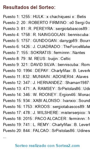 Lista de participantes: 20 ROBERTO FIRMINO o0 Sergi 0o Everton, 33 A. SCHURRLE perikinho90 Cordoba, 41 M. NEUER KaOs I AsTuR Oviedo, 43 J. BOATENG echateunfifa Ol. Marsella, 45 P. LAHM tabascos89 Barcelona, 48 A. ROBBEN Nandobel Real Madrid, 49 T. MULLER Maybecohen Zaragoza, 50 F. RIBERY Ergion46 Monaco, 57 D. ALABA Havel7 Psg, 62 M. HUMMELS ChaoticHornet67 Toronto, 66 M. GOTZE P3drito Sion, 74 R. LEWANDOWSKI Havel7 Psg, 79 M. REUS buijin Celtic, 81 R. PEREYRA sergiotabascos89 Manchester United, 90 K. BELLARABI Alex1493 Napoles, 155 SOKRATIS ferminnn Nantes, 156 NALDO Saavexbox Las Palmas, 244 P. CECH ESP SNAKE1986 Ath. Bilbao, 252 D. STURRIDGE MrMohamRam Liverpool, 254 MATA trompexbox360 Chicago Fire, 256 DAVID LUIZ misterserpico West Ham, 264 R. LUKAKU moiaguilera Oporto, 279 P. POGBA Balles Malmoe, 305 L. SUAREZ**** x chachiquesi x Betis, 316 V. KOMPANY victub Valencia, 319 Y. TOURE alead71 Tottenham, 321 DAVID SILVA benniscuba Roma, 323 S. AGÜERO SrPistolas86 Udinese, 324 C. TEVEZ diego_gallego Orlando City, 334 Y. KONOPLYANKA Charlyfifax B. Leverkusen, 337 DE GEA javitr Manchester City, 346 W. ROONEY Ergion46 Monaco, 347 J. HERNANDEZ Shaman1987 Red Bulls, 378 A. TAARABT trompexbox360 Chicago Fire, 414 L. MODRIC javitr Manchester City, 415 G. BALE adrylito Malaga, 433 C. BEAUVUE ulimoreno Juventus, 471 A. RAMSEY SrPistolas86 Udinese, 473 T. WALCOTT alemalaga94 Bayern Munich, 474 R. VAN PERSIE CometHeaven79 Chelsea, 477 L. KOSCIELNY sergiotabascos89 Manchester United, 478 J. WILSHERE misterserpico West Ham, 496 A. MARTIAL TheForceMaker Alcorcon, 584 OSCAR toni1708 Cekta, 604 NEYMAR Balles Malmoe, 609 LUCAS Saavexbox Las Palmas, 635 S. DOUMBIA JG97 Schalke 04, 660 O. MARTINS x iReViiVaL FoX River Plate, 727 E. HAZARD merayombasogo Ponferradina, 741 L. REMY Charlyfifax B. Leverkusen, 754 H. LLORIS sergiotabascos89 Manchester United, 775 J. PASTORE adrylito Malaga, 778 S. SIRIGU javitr Manchester City, 832 MUNIAIN ADONERI4 Alaves, 844 FALCAO SrPistolas86 Udinese, 845 A. TURAN gabripf Cristal Palace, 846 D. GODIN tabascos89 Barcelona, 853 DIEGO COSTA alemalaga94 Bayern Munich, 861 PIQUE SpiffiestJose Ol. Lyon, 863 SERGIO BUSQUETS StormFury elche, 865 CESC FABREGAS iRandy V8 Boca Juniors, 866 INIESTA JG97 Schalke 04, 867 L. MESSI ESP SNAKE1986 Ath. Bilbao, 871 A. SANCHEZ joselitorojas1 Wolsfburgo, 872 THIAGO Ronald Villareal, 873 PEDRO Shaman1987 Red Bulls, 900 SANTI CAZORLA diego_gallego Orlando City, 904 S. RONDON x chachiquesi x Betis, 906 ISCO misterserpico West Ham, 930 SERGIO RAMOS JG97 Schalke 04, 933 MARCELO Adriantr127 Atco. Madrid, 934 XABI ALONSO Ivanxio Sounders, 936 A. DI MARIA ulimoreno Juventus, 937 C. RONALDO**** Saavexbox Las Palmas, 938 M. OZIL Javiyfaina Sevilla, 939 K. BENZEMA javitr Manchester City, 943 G. HIGUAIN MrMohamRam Liverpool, 948 JOSE CALLEJON StormFury elche, 979 I. RAKITIC**** x chachiquesi x Betis, 999 JORDI ALBA Saavexbox Las Palmas, 1028 THIAGO SILVA sergiotabascos89 Manchester United, 1035 Z. IBRAHIMOVIC Ivanxio Sounders, 1075 A. CANDREVA trompexbox360 Chicago Fire, 1118 W. SNEIJDER Adriantr127 Atco. Madrid, 1136 G. CHIELLINI o0 Sergi 0o Everton, 1138 A. VIDAL Shaman1987 Red Bulls, 1147 C. MARCHISIO Javiyfaina Sevilla, 1185 CAVANI CometHeaven79 Chelsea, 1217 M. PJANIC Javiyfaina Sevilla, 1251 N. OTAMENDI javitr Manchester City, 1255 HULK x chachiquesi x Betis, 1259 JAMES RODRIGUEZ misterserpico West Ham, 1331 K. DE BRUYNE alexfcbarcelona B. Dortmund, 1426 J. CUADRADO TheForceMaker Alcorcon, 1524 PHILIPPE COUTINHO AndrewTorres Real Sociedad, 1610 N. MATIC CometHeaven79 Chelsea, 1619 P. AUBAMEYANG benniscuba Roma, 1668 D. MERTENS joselitorojas1 Wolsfburgo, 1729 PIRLO moiaguilera Oporto, 1730 ERIKSEN iGosling V9 Arsenal, 1753 KROOS sergiotabascos89 Manchester United, 1755 C. VELA StormFury elche, 1756 WITSEL trunks Levante, 1757 GUNDOGAN danygp89 Bournomenth, 1758 R. NAINGGOLAN benniscuba Roma, 1784 T. COURTOIS SpiffiestJose Ol. Lyon, 1797 MATUIDI Ergion46 Monaco, 1803 R. STERLING SrPistolas86 Udinese, 1822 M. VERRATTI HaLiToxGCFx Granada, 1825 C. BENTEKE perikinho90 Cordoba, 1826 R. VARANE sergiotabascos89 Manchester United, 1840 WILLIAN alexfcbarcelona B. Dortmund, 1842 KOKE echateunfifa Ol. Marsella, 1852 MARQUINHOS Pyra el Capo Angeles Galaxy, 1858 B. LENO alead71 Tottenham, 1879 A. ABDENNOUR alexfcbarcelona B. Dortmund, 1888 A. LACAZETTE Pyra el Capo Angeles Galaxy, 1906 A. MORATA adrylito Malaga, 1907 A. GRIEZMANN adrylito Malaga, 1933 P. DYBALA HaLiToxGCFx Granada, 1969 DOUGLAS COSTA trunks Levante, 1994 DEPAY Charlyfifax B. Leverkusen, 2010 C. BACCA Ergion46 Monaco, 2015 PACO ALCACER ferminnn Nantes, 2017 L. VIETTO Pyra el Capo Angeles Galaxy, 2030 A. LAPORTE KaOs I AsTuR Oviedo.