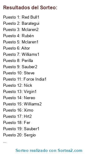Lista de participantes: Barategui, Sugay, Nereo, Perilla, Pointxo, Nick, Fer, Aitor, Ximo, Sergio, Steve, Rubén, Nemesis, Mclaren1, Mclaren2, Williams1, Williams2, Sauber1, Sauber2, Force India1, Force India2, Hrt1, Hrt2, Virgin1, Virgin2, Red Bull1.