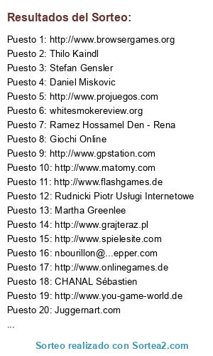 Lista de participantes: http://www.browsergames.org(2 participaciones), http://www.onlinegames.de(2 participaciones), http://www.gamestar.de/(2 participaciones), http://www.panfu.de, http://scoobydoospiele.com/, http://www.projuegos.com(2 participaciones), http://juegos-contiego.blogspot.com, http://juegos-onlines.blogspot.com/, http://www.fds4u.com(2 participaciones), http://www.sitacados.com(2 participaciones), http://www.offerbox.com(2 participaciones), http://guidhtml.altervista.org/, http://www.gpstation.com, http://www.favorit-network.com/(2 participaciones), http://www.fantagiochi.it(2 participaciones), http://www.giochiperpc.net, http://www.komputerswiat.pl(2 participaciones), http://3gplay.pl(2 participaciones), http://www.gry-browserowe.pl(2 participaciones), http://diablo.phx.pl, http://dogry.pl(2 participaciones), http://www.grajteraz.pl(2 participaciones), http://limon-online.ru/, http://www.matomy.com(2 participaciones), http://www.gamerstop.ru, http://www.gezginler.net(2 participaciones), http://www.flashgames.de(2 participaciones), http://www.you-game-world.de(2 participaciones), http://www.games-dream.de/(2 participaciones), http://www.buxflow.com(2 participaciones), http://www.spielesite.com(2 participaciones), http://www.farmeramacheats.de, http://browsergames-kostenlos.de, www.via-ads.de, @webmaster, www.internetgamebox.com(2 participaciones), @nbourillon, www.offermatch.fr, @margarita, http://www.jeu-gratuit.net(2 participaciones), @contact, @odalisc, Thorsten Weigl(2 participaciones), Stefan Gensler(2 participaciones), Polly Parker(2 participaciones), Kai Meinecke(2 participaciones), Patrick Peyre, Daniel Miskovic(2 participaciones), istaberso(2 participaciones), Luta VIorel(2 participaciones), whitesmokereview.org, ehlunding GmbH(2 participaciones), Marketing Adjal, S.L.(2 participaciones), Alin Ariciu(2 participaciones), Epanago Ltd.(2 participaciones), Rudnicki Piotr Usługi Internetowe(2 participaciones), Gregor Krambs(2 participaciones), Gamenet Limited(2 participaciones), Ramez Hossamel Den - Rena(2 participaciones), Giochi Online(2 participaciones), Supernova Advertising S.L.(2 participaciones), Thilo Kaindl(2 participaciones), Asert.pl - Mariusz Mazur(2 participaciones), ADNET(2 participaciones), Gestores Del Nombre Internet S.L.(2 participaciones), Scott Mintz(2 participaciones), Martha Greenlee(2 participaciones), Juggernart.com(2 participaciones), Ben Fathers, Adv Solutions Srl(2 participaciones), mchgames(2 participaciones), CHANAL Sébastien(2 participaciones), jeffrey racoosin, Hungary(2 participaciones), Joselynn Lavilla, http://www.jatekok.org, http://www.italiabrowsergame.com, http://www.idarionis.com, http://www.5rings.ru, cheikh malaynine fds4u.com, richard kramp, christian besant www.computerspiele.com, nabil E-Ouakif www.paid4sofort.de, Jocuri Flash, John Hill, WitchHut LLC.