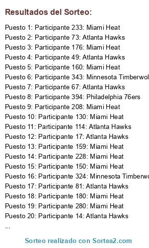 Lista de participantes: Participante 1: Atlanta Hawks, Participante 2: Atlanta Hawks, Participante 3: Atlanta Hawks, Participante 4: Atlanta Hawks, Participante 5: Atlanta Hawks, Participante 6: Atlanta Hawks, Participante 7: Atlanta Hawks, Participante 8: Atlanta Hawks, Participante 9: Atlanta Hawks, Participante 10: Atlanta Hawks, Participante 11: Atlanta Hawks, Participante 12: Atlanta Hawks, Participante 13: Atlanta Hawks, Participante 14: Atlanta Hawks, Participante 15: Atlanta Hawks, Participante 16: Atlanta Hawks, Participante 17: Atlanta Hawks, Participante 18: Atlanta Hawks, Participante 19: Atlanta Hawks, Participante 20: Atlanta Hawks, Participante 21: Atlanta Hawks, Participante 22: Atlanta Hawks, Participante 23: Atlanta Hawks, Participante 24: Atlanta Hawks, Participante 25: Atlanta Hawks, Participante 26: Atlanta Hawks, Participante 27: Atlanta Hawks, Participante 28: Atlanta Hawks, Participante 29: Atlanta Hawks, Participante 30: Atlanta Hawks, Participante 31: Atlanta Hawks, Participante 32: Atlanta Hawks, Participante 33: Atlanta Hawks, Participante 34: Atlanta Hawks, Participante 35: Atlanta Hawks, Participante 36: Atlanta Hawks, Participante 37: Atlanta Hawks, Participante 38: Atlanta Hawks, Participante 39: Atlanta Hawks, Participante 40: Atlanta Hawks, Participante 41: Atlanta Hawks, Participante 42: Atlanta Hawks, Participante 43: Atlanta Hawks, Participante 44: Atlanta Hawks, Participante 45: Atlanta Hawks, Participante 46: Atlanta Hawks, Participante 47: Atlanta Hawks, Participante 48: Atlanta Hawks, Participante 49: Atlanta Hawks, Participante 50: Atlanta Hawks, Participante 51: Atlanta Hawks, Participante 52: Atlanta Hawks, Participante 53: Atlanta Hawks, Participante 54: Atlanta Hawks, Participante 55: Atlanta Hawks, Participante 56: Atlanta Hawks, Participante 57: Atlanta Hawks, Participante 58: Atlanta Hawks, Participante 59: Atlanta Hawks, Participante 60: Atlanta Hawks, Participante 61: Atlanta Hawks, Participante 62: Atlanta Hawks, Participante 63: Atlanta Hawks, Participante 64: Atlanta Hawks, Participante 65: Atlanta Hawks, Participante 66: Atlanta Hawks, Participante 67: Atlanta Hawks, Participante 68: Atlanta Hawks, Participante 69: Atlanta Hawks, Participante 70: Atlanta Hawks, Participante 71: Atlanta Hawks, Participante 72: Atlanta Hawks, Participante 73: Atlanta Hawks, Participante 74: Atlanta Hawks, Participante 75: Atlanta Hawks, Participante 76: Atlanta Hawks, Participante 77: Atlanta Hawks, Participante 78: Atlanta Hawks, Participante 79: Atlanta Hawks, Participante 80: Atlanta Hawks, Participante 81: Atlanta Hawks, Participante 82: Atlanta Hawks, Participante 83: Atlanta Hawks, Participante 84: Atlanta Hawks, Participante 85: Atlanta Hawks, Participante 86: Atlanta Hawks, Participante 87: Atlanta Hawks, Participante 88: Atlanta Hawks, Participante 89: Atlanta Hawks, Participante 90: Atlanta Hawks, Participante 91: Atlanta Hawks, Participante 92: Atlanta Hawks, Participante 93: Atlanta Hawks, Participante 94: Atlanta Hawks, Participante 95: Atlanta Hawks, Participante 96: Atlanta Hawks, Participante 97: Atlanta Hawks, Participante 98: Atlanta Hawks, Participante 99: Atlanta Hawks, Participante 100: Atlanta Hawks, Participante 101: Atlanta Hawks, Participante 102: Atlanta Hawks, Participante 103: Atlanta Hawks, Participante 104: Atlanta Hawks, Participante 105: Atlanta Hawks, Participante 106: Atlanta Hawks, Participante 107: Atlanta Hawks, Participante 108: Atlanta Hawks, Participante 109: Atlanta Hawks, Participante 110: Atlanta Hawks, Participante 111: Atlanta Hawks, Participante 112: Atlanta Hawks, Participante 113: Atlanta Hawks, Participante 114: Atlanta Hawks, Participante 115: Atlanta Hawks, Participante 116: Atlanta Hawks, Participante 117: Miami Heat, Participante 118: Miami Heat, Participante 119: Miami Heat, Participante 120: Miami Heat, Participante 121: Miami Heat, Participante 122: Miami Heat, Participante 123: Miami Heat, Participante 124: Miami Heat, Participante 125: Miami Heat, Participante 126: Miami Heat, Participante 127: Miami Heat, Participante 128: Miami Heat, Participante 129: Miami Heat, Participante 130: Miami Heat, Participante 131: Miami Heat, Participante 132: Miami Heat, Participante 133: Miami Heat, Participante 134: Miami Heat, Participante 135: Miami Heat, Participante 136: Miami Heat, Participante 137: Miami Heat, Participante 138: Miami Heat, Participante 139: Miami Heat, Participante 140: Miami Heat, Participante 141: Miami Heat, Participante 142: Miami Heat, Participante 143: Miami Heat, Participante 144: Miami Heat, Participante 145: Miami Heat, Participante 146: Miami Heat, Participante 147: Miami Heat, Participante 148: Miami Heat, Participante 149: Miami Heat, Participante 150: Miami Heat, Participante 151: Miami Heat, Participante 152: Miami Heat, Participante 153: Miami Heat, Participante 154: Miami Heat, Participante 155: Miami Heat, Participante 156: Miami Heat, Participante 157: Miami Heat, Participante 158: Miami Heat, Participante 159: Miami Heat, Participante 160: Miami Heat, Participante 161: Miami Heat, Participante 162: Miami Heat, Participante 163: Miami Heat, Participante 164: Miami Heat, Participante 165: Miami Heat, Participante 166: Miami Heat, Participante 167: Miami Heat, Participante 168: Miami Heat, Participante 169: Miami Heat, Participante 170: Miami Heat, Participante 171: Miami Heat, Participante 172: Miami Heat, Participante 173: Miami Heat, Participante 174: Miami Heat, Participante 175: Miami Heat, Participante 176: Miami Heat, Participante 177: Miami Heat, Participante 178: Miami Heat, Participante 179: Miami Heat, Participante 180: Miami Heat, Participante 181: Miami Heat, Participante 182: Miami Heat, Participante 183: Miami Heat, Participante 184: Miami Heat, Participante 185: Miami Heat, Participante 186: Miami Heat, Participante 187: Miami Heat, Participante 188: Miami Heat, Participante 189: Miami Heat, Participante 190: Miami Heat, Participante 191: Miami Heat, Partic