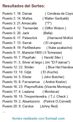 Lista de participantes: 1. BadLuck ( Padre Santiago), 2. Abuelozorro (Patrick O,Connell), 3. Silver el largo ( Jim "El Fulanas"), 4. Leatana ( Mordecai), 5. Elister ( John Butcher), 6. Franguau ( Treviño Cortez), 7. Playiñaki ( Harold Siler ), 8. Fercaramus ( Andrei Koslov), 9. Carolus (Johny Red), 10. Cdjiz ( El chucho), 11. Mansion1900 ( Il Torinesse), 12. Tremendet. ( Cliffor Wiston ), 13. Sarrat. ( El cirujano), 14. Mañas. ( Walter Garibaldi), 15. Tinopontevedra. ( T.J. Check ), 16. El Click Campeador ( GUS), 17. Paleoclick (Harrisond McKoland), 18. Danae ( Condesa de Coyoacan), 19. Parlilleskano ( Nube azabache), 20. Jack (Bella), 21.Amoscalla ("T"), 22. Strider ( Blue Hat Handsome), 23. PlaymoRubio (Vicente Montoya), 24. Viejo Borracho CPU.