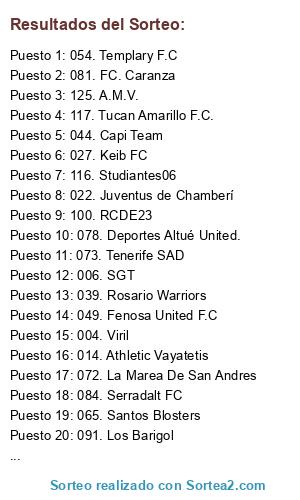 Lista de participantes: 001. Los Bandarras C.F., 002. Inter Chiscon, 003. Dias de futbol, 004. Viril, 005. AC Milàn, 006. SGT, 007. Blanquiazules, 008. Koka Juniors, 009. Urbanrivals, 010. UD Almeria, 011. Altachando, 012. Lincoln F.C, 013. FC Atlético Madrid, 014. Athletic Vayatetis, 015. U.D.Mataporculo, 016. Vozka Negro, 017. República de Campoamor, 018. Asturies CF, 019. Athletic Bilbao!, 020. Berberechos F.C., 021. Pelo y Barba F.C., 022. Juventus de Chamberí, 023. Serendipity, 024. Los Iagos, 025. Selección de España, 026. F.C.Almagro, 027. Keib FC, 028. Real Sociedad 100, 029. La Joya del Nilo, 030. Celta 04, 031. Afrodita, 032. Athletics, 033. F.C.Z., 034. Barcones, 035. Azurro, 036. Los Peitos, 037. F.Stuenti, 038. Ajax F.C., 039. Rosario Warriors, 040. S.U.D., 041. A.S edio a Roma, 042. Campo Maneiro F.C, 043. Xaodixen Deportivo, 044. Capi Team, 045. Umberteam, 046. Looprevil, 047. Las Monjitas de la Birra, 048. Bigumians C.F., 049. Fenosa United F.C, 050. Grajalejo, 051. Pro2009, 052. Los_Pitufos, 053. Leonis Utd., 054. Templary F.C, 055. F.C Pedraza, 056. Kirguizistan, 057. Nouvelle Ciprenelli, 058. Pontedatorre, 059. Hostion in the Night, 060. Plottier, 061. RCD HK, 062. San Villo, 063. Botepronto, 064. Moro C.F, 065. Santos Blosters, 066. Fulminense FC, 067. Vamonos que AITORmenta, 068. Hysteria Funzionil, 069. Retamar FC, 070. Blood Time, 071. Bailador F.C, 072. La Marea De San Andres, 073. Tenerife SAD, 074. Real Arco Norte C.F, 075. C.D. Union, 076. Yesteelmejor, 077. Deportivo Corunha, 078. Deportes Altué United., 079. Dolphins 47, 080. La 55, 081. FC. Caranza, 082. Depotivo Althusseriano, 083. Messi-As FC, 084. Serradalt FC, 085. C.D. Genoa, 086. CF Madrid 08, 087. Farloperos, 088. Hielasangre FC, 089. Black Dream, 090. Galaroza Atletico FC, 091. Los Barigol, 092. Loperaveteya, 093. Berton F.C., 094. Manchitas, 095. AgroNuestraFuente, 096. El Fortín de Líniers FC, 097. RCD 4+K Bienda, 098. FC_barcelona, 099. Los Kinkiss!!!!, 100. RCDE23, 101. The Golden G, 102. MaccabiDeLevanta C.F., 103. Vil·lareal, 104. Elbarrio F.C, 105. Hercualican, 106. Athletic FC, 107. Rasenhar F.C., 108. Argentino 100%, 109. Deapes Team, 110. Los Origenes, 111. Orense United, 112. Vayron, 113. Dry Town, 114. Los Pijudos del Sur, 115. SD Córdoba, 116. Studiantes06, 117. Tucan Amarillo F.C., 118. F.C. Diablo, 119. C.F. Sergio, 120. Gaditanos con Style, 121. Salamança C.F., 122. La Finta y el Sprint F.C., 123. Getxo CF, 124. Sporting Riazano F.C. , 125. A.M.V., 126. Deportivo Lugués, 127. F.C. San Batalome, 128. Ormalanz.