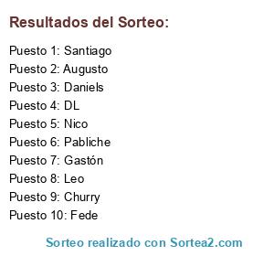 Lista de participantes: 1- Gastón, 2- Mati, 3- Gabi (amigo pablo 2), 4- @Daniels (LIESA), 5- @Leo (LIESA), 6- Santiago, 7- Fede, 8- Churry, 9- Amigo pablo (LEO), 10-DL.