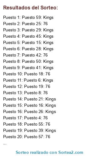 Lista de participantes: Puesto 1: 76, Puesto 2: Kings, Puesto 3: 76, Puesto 4: 76, Puesto 5: Kings, Puesto 6: Kings, Puesto 7: Kings, Puesto 8: 76, Puesto 9: Kings, Puesto 10: Kings, Puesto 11: 76, Puesto 12: 76, Puesto 13: 76, Puesto 14: Kings, Puesto 15: Kings, Puesto 16: Kings, Puesto 17: Kings, Puesto 18: 76, Puesto 19: 76, Puesto 20: Kings, Puesto 21: Kings, Puesto 22: 76, Puesto 23: Kings, Puesto 24: 76, Puesto 25: 76, Puesto 26: Kings, Puesto 27: Kings, Puesto 28: Kings, Puesto 29: Kings, Puesto 30: 76, Puesto 31: Kings, Puesto 32: Kings, Puesto 33: 76, Puesto 34: 76, Puesto 35: 76, Puesto 36: 76, Puesto 37: 76, Puesto 38: Kings, Puesto 39: Kings, Puesto 40: 76, Puesto 41: Kings, Puesto 42: 76, Puesto 43: Kings, Puesto 44: 76, Puesto 45: Kings, Puesto 46: Kings, Puesto 47: 76, Puesto 48: 76, Puesto 49: Kings, Puesto 50: Kings, Puesto 51: 76, Puesto 52: 76, Puesto 53: 76, Puesto 54: 76, Puesto 55: 76, Puesto 56: Kings, Puesto 57: 76, Puesto 58: 76, Puesto 59: Kings.