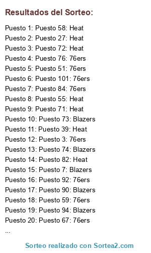 Lista de participantes: Puesto 1: Blazers, Puesto 2: Blazers, Puesto 3: 76ers, Puesto 4: 76ers, Puesto 5: Blazers, Puesto 6: 76ers, Puesto 7: Blazers, Puesto 8: 76ers, Puesto 9: 76ers, Puesto 10: 76ers, Puesto 11: 76ers, Puesto 12: Blazers, Puesto 13: 76ers, Puesto 14: Blazers, Puesto 15: 76ers, Puesto 16: Blazers, Puesto 17: Heat, Puesto 18: Heat, Puesto 19: Blazers, Puesto 20: 76ers, Puesto 21: Heat, Puesto 22: Heat, Puesto 23: Blazers, Puesto 24: 76ers, Puesto 25: 76ers, Puesto 26: Heat, Puesto 27: Heat, Puesto 28: Heat, Puesto 29: Blazers, Puesto 30: Blazers, Puesto 31: 76ers, Puesto 32: Blazers, Puesto 33: 76ers, Puesto 34: 76ers, Puesto 35: Blazers, Puesto 36: 76ers, Puesto 37: 76ers, Puesto 38: Blazers, Puesto 39: Heat, Puesto 40: 76ers, Puesto 41: Heat, Puesto 42: Blazers, Puesto 43: Heat, Puesto 44: Blazers, Puesto 45: 76ers, Puesto 46: 76ers, Puesto 47: Heat, Puesto 48: 76ers, Puesto 49: Blazers, Puesto 50: Heat, Puesto 51: 76ers, Puesto 52: Heat, Puesto 53: Heat, Puesto 54: Heat, Puesto 55: Heat, Puesto 56: 76ers, Puesto 57: 76ers, Puesto 58: Heat, Puesto 59: 76ers, Puesto 60: Heat, Puesto 61: Blazers, Puesto 62: Heat, Puesto 63: Heat, Puesto 64: Blazers, Puesto 65: 76ers, Puesto 66: Blazers, Puesto 67: 76ers, Puesto 68: Heat, Puesto 69: Heat, Puesto 70: Blazers, Puesto 71: Heat, Puesto 72: Heat, Puesto 73: Blazers, Puesto 74: Blazers, Puesto 75: 76ers, Puesto 76: 76ers, Puesto 77: Heat, Puesto 78: Blazers, Puesto 79: Blazers, Puesto 80: 76ers, Puesto 81: 76ers, Puesto 82: Heat, Puesto 83: 76ers, Puesto 84: 76ers, Puesto 85: 76ers, Puesto 86: Blazers, Puesto 87: 76ers, Puesto 88: 76ers, Puesto 89: Heat, Puesto 90: Blazers, Puesto 91: 76ers, Puesto 92: 76ers, Puesto 93: 76ers, Puesto 94: Blazers, Puesto 95: Blazers, Puesto 96: Blazers, Puesto 97: Blazers, Puesto 98: 76ers, Puesto 99: Blazers, Puesto 100: 76ers, Puesto 101: 76ers, Puesto 102: 76ers.