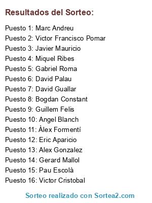 Lista de participantes: Alex Gonzalez, Angel Blanch, Bogdan Constant, David Guallar, David Palau, Eric Aparicio, Gabriel Roma, Gerard Mallol, Guillem Felis, Javier Mauricio, Marc Andreu, Miquel Ribes, Pau Escolà, Victor Cristobal, Victor Francisco Pomar, Àlex Formentí.