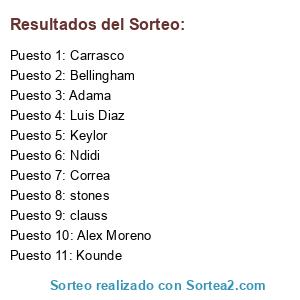 Lista de participantes: Keylor, clauss, Kounde, stones, Alex Moreno, Ndidi, Bellingham, Correa, Luis Diaz, Adama, Carrasco.