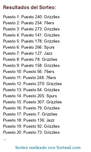 Lista de participantes: Puesto 1: 76ers, Puesto 2: Grizzlies, Puesto 3: Grizzlies, Puesto 4: Nets, Puesto 5: Spurs, Puesto 6: Grizzlies, Puesto 7: Grizzlies, Puesto 8: Grizzlies, Puesto 9: Hawks, Puesto 10: Grizzlies, Puesto 11: Grizzlies, Puesto 12: Grizzlies, Puesto 13: Grizzlies, Puesto 14: Grizzlies, Puesto 15: Nets, Puesto 16: Nets, Puesto 17: Grizzlies, Puesto 18: Wizards, Puesto 19: Grizzlies, Puesto 20: Grizzlies, Puesto 21: Grizzlies, Puesto 22: Nets, Puesto 23: Grizzlies, Puesto 24: Grizzlies, Puesto 25: Nets, Puesto 26: Grizzlies, Puesto 27: Grizzlies, Puesto 28: 76ers, Puesto 29: 76ers, Puesto 30: Grizzlies, Puesto 31: Grizzlies, Puesto 32: Grizzlies, Puesto 33: Grizzlies, Puesto 34: Grizzlies, Puesto 35: Warriors, Puesto 36: Grizzlies, Puesto 37: Grizzlies, Puesto 38: Grizzlies, Puesto 39: Grizzlies, Puesto 40: 76ers, Puesto 41: Grizzlies, Puesto 42: Wizards, Puesto 43: Grizzlies, Puesto 44: Spurs, Puesto 45: Rockets, Puesto 46: Grizzlies, Puesto 47: Grizzlies, Puesto 48: Grizzlies, Puesto 49: Wizards, Puesto 50: Grizzlies, Puesto 51: Rockets, Puesto 52: Grizzlies, Puesto 53: Grizzlies, Puesto 54: Grizzlies, Puesto 55: 76ers, Puesto 56: Grizzlies, Puesto 57: Rockets, Puesto 58: Grizzlies, Puesto 59: Hawks, Puesto 60: Grizzlies, Puesto 61: Grizzlies, Puesto 62: Grizzlies, Puesto 63: Nets, Puesto 64: Hawks, Puesto 65: Grizzlies, Puesto 66: Grizzlies, Puesto 67: Grizzlies, Puesto 68: Grizzlies, Puesto 69: Spurs, Puesto 70: Grizzlies, Puesto 71: Spurs, Puesto 72: Grizzlies, Puesto 73: Nets, Puesto 74: Grizzlies, Puesto 75: Grizzlies, Puesto 76: Grizzlies, Puesto 77: Grizzlies, Puesto 78: Grizzlies, Puesto 79: Grizzlies, Puesto 80: Grizzlies, Puesto 81: 76ers, Puesto 82: Grizzlies, Puesto 83: Grizzlies, Puesto 84: Spurs, Puesto 85: Grizzlies, Puesto 86: Grizzlies, Puesto 87: Grizzlies, Puesto 88: Grizzlies, Puesto 89: Grizzlies, Puesto 90: Wizards, Puesto 91: Grizzlies, Puesto 92: Grizzlies, Puesto 93: Grizzlies, Puesto 94: Grizzlies, Puesto 95: Grizzlies, Puesto 96: Grizzlies, Puesto 97: Rockets, Puesto 98: Warriors, Puesto 99: Spurs, Puesto 100: Grizzlies, Puesto 101: Grizzlies, Puesto 102: Grizzlies, Puesto 103: Grizzlies, Puesto 104: Grizzlies, Puesto 105: Nets, Puesto 106: Spurs, Puesto 107: Wizards, Puesto 108: Spurs, Puesto 109: Grizzlies, Puesto 110: Grizzlies, Puesto 111: Warriors, Puesto 112: 76ers, Puesto 113: Grizzlies, Puesto 114: Grizzlies, Puesto 115: Grizzlies, Puesto 116: Grizzlies, Puesto 117: Grizzlies, Puesto 118: Grizzlies, Puesto 119: Grizzlies, Puesto 120: Grizzlies, Puesto 121: Grizzlies, Puesto 122: Nets, Puesto 123: Grizzlies, Puesto 124: Grizzlies, Puesto 125: Grizzlies, Puesto 126: Warriors, Puesto 127: Rockets, Puesto 128: Grizzlies, Puesto 129: 76ers, Puesto 130: Grizzlies, Puesto 131: 76ers, Puesto 132: Spurs, Puesto 133: Spurs, Puesto 134: Nets, Puesto 135: Nets, Puesto 136: Grizzlies, Puesto 137: Grizzlies, Puesto 138: Grizzlies, Puesto 139: Grizzlies, Puesto 140: Grizzlies, Puesto 141: Grizzlies, Puesto 142: Rockets, Puesto 143: Grizzlies, Puesto 144: Grizzlies, Puesto 145: Grizzlies, Puesto 146: Grizzlies, Puesto 147: 76ers, Puesto 148: Grizzlies, Puesto 149: Grizzlies, Puesto 150: Hawks, Puesto 151: Spurs, Puesto 152: Grizzlies, Puesto 153: Grizzlies, Puesto 154: Grizzlies, Puesto 155: Grizzlies, Puesto 156: Grizzlies, Puesto 157: Hawks, Puesto 158: Grizzlies, Puesto 159: Grizzlies, Puesto 160: Grizzlies, Puesto 161: Grizzlies, Puesto 162: Grizzlies, Puesto 163: Grizzlies, Puesto 164: Rockets, Puesto 165: Grizzlies, Puesto 166: Grizzlies, Puesto 167: Rockets, Puesto 168: Grizzlies, Puesto 169: Grizzlies, Puesto 170: Warriors, Puesto 171: Wizards, Puesto 172: Grizzlies, Puesto 173: Grizzlies, Puesto 174: Hawks, Puesto 175: Grizzlies, Puesto 176: 76ers, Puesto 177: Rockets, Puesto 178: Grizzlies, Puesto 179: Nets, Puesto 180: 76ers, Puesto 181: Grizzlies, Puesto 182: Grizzlies, Puesto 183: Grizzlies, Puesto 184: Spurs, Puesto 185: Rockets, Puesto 186: Grizzlies, Puesto 187: Hawks, Puesto 188: Grizzlies, Puesto 189: Grizzlies, Puesto 190: Rockets, Puesto 191: Grizzlies, Puesto 192: Grizzlies, Puesto 193: Grizzlies, Puesto 194: Warriors, Puesto 195: Grizzlies, Puesto 196: Grizzlies, Puesto 197: Grizzlies, Puesto 198: Grizzlies, Puesto 199: Grizzlies, Puesto 200: Grizzlies, Puesto 201: Wizards, Puesto 202: Grizzlies, Puesto 203: Grizzlies, Puesto 204: Rockets, Puesto 205: 76ers, Puesto 206: Wizards, Puesto 207: Warriors, Puesto 208: Grizzlies, Puesto 209: Nets, Puesto 210: Grizzlies, Puesto 211: Grizzlies, Puesto 212: Rockets, Puesto 213: Grizzlies, Puesto 214: Grizzlies, Puesto 215: Hawks, Puesto 216: Grizzlies, Puesto 217: Hawks, Puesto 218: Nets, Puesto 219: Grizzlies, Puesto 220: Nets, Puesto 221: Grizzlies, Puesto 222: Grizzlies, Puesto 223: Grizzlies, Puesto 224: Grizzlies, Puesto 225: Wizards, Puesto 226: Grizzlies, Puesto 227: Grizzlies, Puesto 228: Grizzlies, Puesto 229: Nets, Puesto 230: Spurs, Puesto 231: 76ers, Puesto 232: Grizzlies, Puesto 233: Grizzlies, Puesto 234: Rockets, Puesto 235: Wizards, Puesto 236: Warriors, Puesto 237: Grizzlies, Puesto 238: Grizzlies, Puesto 239: Grizzlies, Puesto 240: Hawks, Puesto 241: Grizzlies, Puesto 242: Grizzlies, Puesto 243: Grizzlies, Puesto 244: Grizzlies, Puesto 245: Grizzlies, Puesto 246: Grizzlies, Puesto 247: Grizzlies, Puesto 248: Grizzlies, Puesto 249: Warriors, Puesto 250: Rockets, Puesto 251: Grizzlies, Puesto 252: Hawks, Puesto 253: Grizzlies, Puesto 254: Rockets, Puesto 255: Grizzlies, Puesto 256: Hawks, Puesto 257: Grizzlies, Puesto 258: Grizzlies, Puesto 259: Grizzlies, Puesto 260: Grizzlies, Puesto 261: Spurs, Puesto 262: Grizzlies, Puesto 263: Grizzlies, Puesto 264: Grizzlies, Puesto 265: Hawks, Puesto 266: Grizzlies, Puesto 267: Grizzlies, Puesto 268: Nets, Puesto 269: Grizzlies, Puesto 270: Grizzlies, Puesto 271: Warriors, Puesto 272: Grizzlies, Puesto 273: Nets, Puesto 274: Grizzlies, Puesto 275: Nets, Puesto 276: Nets, Puesto 277: Grizzlies, Puesto 278: Grizzlies, Puesto 279: Griz