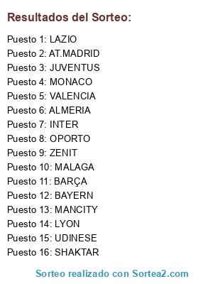 Lista de participantes: MONACO, BARÇA, MALAGA, MANCITY, ZENIT, ALMERIA, LAZIO, OPORTO, INTER, VALENCIA, BAYERN, AT.MADRID, LYON, JUVENTUS, SHAKTAR, UDINESE.