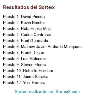 Lista de participantes: Fred Guardado, Carlos Contreras, Roberto Escobar, Frank Duque, David Pineda, Rafa Enrike Mrtz, Luis Melendez, Kevin Benitez, Yoni Herrera, Steven Flores, Jaime Saravia, Mathew Javier Andrade Mosquera.