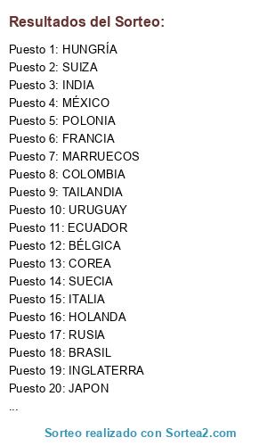 Lista de participantes: ARGENTINA, URUGUAY, CHILE, BRASIL, PERÚ, COLOMBIA, ECUADOR, PANAMÁ, EEUU, MÉXICO, CUBA, ESPAÑA, MARRUECOS, FRANCIA, INGLATERRA, ALEMANIA, NORUEGA, TURUQUIA, SUIZA, SUECIA, POLONIA, RUSIA, COREA, JAPON, UCRANIA, ITALIA, HOLANDA, BÉLGICA, HUNGRÍA, PARAGUAY, INDIA, TAILANDIA.