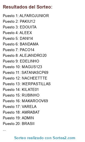 Lista de participantes: ADMIN, PEDRO22, IKERPASTILLAS, ALEJANDRO20, EDELINHO, ALEEX, BRASII, NACHEETTTE, RUBINHO, PACO14, MAGUS123, SATANASCP69, RUBEN94, KILATE01, PAKIU12, MAKAROOV69, BANDAMA, CARECA, VARELA, AMRABAT, DANI14, EDOUITA, ALFAROJUNIOR.