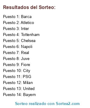 Lista de participantes: Barca, Real, Inter, Milan, Juve, Chelsea, City, United, PSG, Bayern, Tottenham, Fiore, Napoli, Atletico.