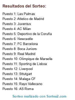 Lista de participantes: FC Barcelona, Juventus, AC Milan, Malaga CF, Las Palmas, Atletico de Madrid, Deportivo de la Coruña, Olimpique de Marsella, Real Madrid, Liverpool, Sporting de Lisboa, Sttutgart, Newcastle, Boca Juniors, Rayo Vallecano, AS Roma.