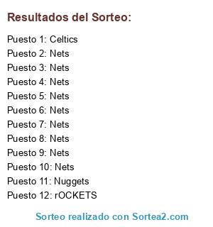 Lista de participantes: Celtics(30), Grizlies(17), Hawks(17), Heat(17), Knicks(31), Nets(385), Nuggets(18), Pacers(11), Pistons(25), rOCKETS(15), bLAZERS(35), Warriors(23).