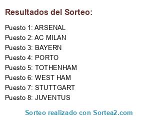 Lista de participantes: AC MILAN, JUVENTUS, PORTO, ARSENAL, BAYERN, TOTHENHAM, STUTTGART, WEST HAM.