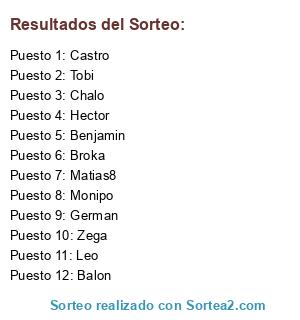 Lista de participantes: Castro, Balon, German, Chalo, Broka, Monipo, Hector, Benjamin, Leo, Tobi, Zega, Matias8.