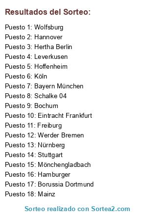 Lista de participantes: Stuttgart, Bayern München, Hoffenheim, Hamburger , Borussia Dortmund, Mönchengladbach, Wolfsburg, Schalke 04, Nürnberg, Mainz, Köln, Hannover, Eintracht Frankfurt, Werder Bremen, Bochum, Hertha Berlin, Leverkusen, Freiburg.