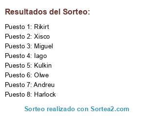 Lista de participantes: Miguel, Kulkin, Iago, Xisco, Harlock, Rikirt, Olwe, Andreu.