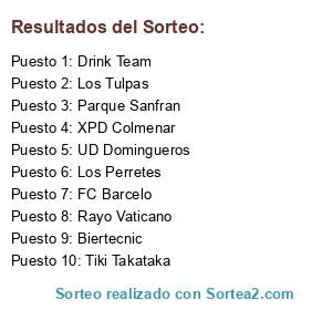Lista de participantes: Tiki Takataka, Rayo Vaticano, Parque Sanfran, UD Domingueros, Biertecnic, Los Perretes, Drink Team, FC Barcelo, XPD Colmenar, Los Tulpas.