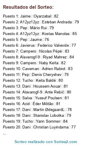 Lista de participantes: Tucho Antonio Mirante 79, Dani Aaron Wan-Bissaka 79, Carlos Abdou Diallo 79, Campero Abdoulaye Doucouré 81, Romeritto Achraf HakimiL 79, A12yz12yz Adama Traoré 76, Campero Alban LafontL 79, Javierux Aleksandar Kolarov 82, Romeritto Aleñá 76, Alavarogf-9 Alessandro Florenzi 81, Dani Alessio Cragno 81, Caveman Alex Meret 78, Campero Alex Oxlade-Chamberlain 80, Alavarogf-9 Alex Teixeira 79, Tucho Alexandr Golovin 79, Javierux Allan Saint-Maximin 79, Caveman Alphonse Areola 82, Carlos Ander Herrera 82, Salva André Gomes 80, Campero André Onana 82, Carlos Andrea Belotti 82, Carlos Andrey Lunev 79, A12yz12yz Andriy Lunin 76, Pep Ángel Correa 82, Javierux Angeliño 79, Alavarogf-9 Ante Rebić 80, Salva Antonio Rüdiger 82, Tucho Arthur Masuaku 76, Alavarogf-9 Badou Ndiaye 76, Jaime Benjamin Pavard 79, Jaime Benjamin Stambouli 79, Pep Benjamin Verbič 79, Romeritto Bertrand Traoré 78, Campero Bruma 78, Salva Callum Wilson 80, A12yz12yz Capa 78, Romeritto Cédric Bakambu 82, Jaime Cengiz Ünder 78, Salva Chris Smalling 80, Dani Christian Luyindama 77, Carlos Christian Pulisic 79, Pep Cristian Pavón 78, Tucho Damián Suárez 79, Salva Dan-Axel Zagadou 79, Carlos Dani CeballosL 81, Romeritto Dani Olmo 79, Acid Daniel Podence 78, Carlos Daniel Wass 80, A12yz12yz Daniele De Rossi 82, Tucho Daniele Rugani 82, Jaime Danilo 79, Pep Danny da Costa 79, Dani David Abraham 78, Acid David Neres 81, Javierux David Soria 82, A12yz12yz Dayot Upamecano 77, Carlos De Tomás 79, Acid DeAndre Yedlin 76, Pep Denis Cheryshev 79, Carlos Denis Zakaria 78, Tucho Denzel Dumfries 78, A12yz12yz Deulofeu 80, Romeritto Diego Carlos 79, Tucho Divock Origi 78, Salva Dominik Livaković 79, Caveman Donny van de Beek 81, A12yz12yz Douglas Costa 84, Acid Éder Militão 81, Dani Edgar Manuel Guichón 78, Carlos Eduardo Salvio 80, Javierux Eljero Elia 77, Alavarogf-9 Emmanuel Boateng 77, Caveman Emre Can 81, Pep Enzo Martín Riquero 79, Acid Eric Bailly 80, A12yz12yz Esteban Andrada 79, Acid Ezequiel Lavezzi 79, Javierux Federico Chiesa 79, Alavarogf-9 Ferland Mendy 80, Salva Franck Yannick Kessié 79, Alavarogf-9 Frank Acheampong 77, Alavarogf-9 Frank Fabra 77, Acid Fred 79, Caveman Gabriel Jesus 82, Pep Gabriel Paulista 82, Carlos Gayà 80, Salva Gelson Martins 82, Javierux Geoffrey Kondogbia 81, Alavarogf-9 Georgiy Dzhikiya 78, Alavarogf-9 Guaita 79, Campero Héctor Herrera 82, Campero Henrikh Mkhitaryan 81, Acid Henry Onyekuru 78, Acid Herrerín 79, Acid Hirving Lozano 82, Dani Houssem Aouar 81, Alavarogf-9 Ibrahim Amadou 78, Jaime Ibrahima Konaté 79, Alavarogf-9 Ike Opara 76, Campero Iñaki Williams 82, Caveman Ismaïla Sarr 78, Romeritto Issa Diop 78, Romeritto Jadon Sancho 84, Pep Jaime Nicolás Frendado 81, Pep Jamie Vardy 82, Acid Jason Denayer 79, Pep Jaume 76, Tucho Jean-Paul Boëtius 78, Acid Jean-Philippe Gbamin 79, Caveman Jefferson Lerma 79, Carlos Jeison MurilloL 79, Salva Jérôme Roussillon 82, Salva Jesse Lingard 82, A12yz12yz Jesús Navas 82, Alavarogf-9 Joakim Mæhle 77, Dani João Félix 80, Campero Joe Gomez 80, Caveman Joel Matip 82, Tucho Joel Robles 78, Romeritto John Brooks 79, Jaime Jonathan Ikoné 78, Caveman Jordan Lukaku 77, Dani Joshua King 79, Romeritto Juan Musso 78, Javierux Juiano Mestres 82, Jaime Julian Brandt 84, Acid Junior Firpo 79, Romeritto Justin Kluivert 76, Alavarogf-9 Kai Havertz 84, Romeritto Karim Bellarabi 82, Tucho Keita Baldé 80, Dani Kerem Demirbay 82, Carlos Kevin Mbabu 77, Tucho Kevin Vogt 80, Caveman Kevin Volland 82, A12yz12yz Kieran Tierney 76, Caveman Kingsley Coman 84, A12yz12yz Kurt Zouma 80, Dani Kyle Walker 84, Dani Lautaro Martínez 81, Romeritto Leandro Trossard 79, Alavarogf-9 Leon Bailey 82, Javierux Leonardo Pavoletti 78, Jaime Lorenzo Pellegrini 79, Dani Loris KariusL 79, Carlos Lucas Paquetá 79, Dani Luciano Acosta 76, Campero Luis Muriel 80, Campero Lukas Klostermann 79, Alavarogf-9 Łukasz Fabiański 82, A12yz12yz Malcom 82, Tucho Manuel Lazzari 79, Javierux Marcano 79, A12yz12yz Marcos Rojo 78, Salva Marcus Rashford 83, Pep Mariano 79, Javierux Mariano 79, Javierux Mario Hermoso 80, Pep Mário Rui 79, Dani Martin ØdegaardL 78, A12yz12yz Mateo Kovačić 82, Salva Matías Vargas 77, Caveman Matías Zaracho 78, Salva Mattia Perin 82, Campero Maxwel Cornet 76, Salva M'Baye Niang 77, Carlos Mbwana Ally Samatta 79, Javierux Memphis Depay 84, Caveman Michael Ngadeu-Ngadjui 78, A12yz12yz Michail Antonio 78, Campero Milot Rashica 79, Tucho Morales 81, Javierux Mouctar Diakhaby 77, Jaime Moussa Dembélé 79, Alavarogf-9 Moussa Marega 80, Acid Moussa Sissoko 81, Alavarogf-9 Mubarak Wakaso 76, Caveman Munir 79, Campero Naby Keïta 82, Dani Nacho Fernández 82, Caveman Nadiem Amiri 78, Acid Nahitan Nández 77, Jaime Nathan Aké 81, Romeritto Nélson Semedo 82, Javierux Nick Pope 79, Jaime Nico Schulz 82, Campero Nicolas Pépé 83, Tucho Nicolás Tagliafico 82, Pep Niklas Stark 79, Tucho Ogenyi Onazi 76, Romeritto Okay Yokuşlu 78, Carlos Ousmane Dembélé 84, Jaime Oyarzabal 82, Pep Paulinho 84, Jaime Pierluigi Gollini 76, Tucho Piotr Zieliński 81, Carlos Presnel Kimpembe 82, Javierux Quincy Promes 82, Romeritto Raphaelito Anjos 82, Salva Raphinha 79, Jaime Renan Lodi 77, Salva Renzo Saravia 78, Salva Richarlison 79, Carlos Rodrigo Bentancur 79, Pep Rodrygo 76, Dani Ross Barkley 79, Campero Rúben Dias 80, Pep Rúben Vezo 77, Javierux Ruslan Malinovskyi 79, Tucho Ryan Babel 78, A12yz12yz Sander Berge 79, Acid Santiago Arias 79, A12yz12yz Segundo Mandíquez 81, Caveman Serge Aurier 79, Caveman Sergi Roberto 82, Pep Sergio Asenjo 82, Javierux Simone Zaza 80, Dani Stanislav Lobotka 79, Dani Stephan El Shaarawy 82, Jaime Steven Bergwijn 82, Romeritto Taison 82, Jaime Tammy Abraham 76, Jaime Tanguy Ndombele 81, Campero Theo Hernández 76, Campero Thiago Mendes 81, Caveman Thilo Kehrer 79, Pep Thomas Delaney 82, Alavarogf-9 Thomas Meunier 82, Romeritto Thomas Partey 82, Carlos Thomas Strakosha 82, Tucho Tiémoué Bakayoko 80, Jaime Timo Horn 