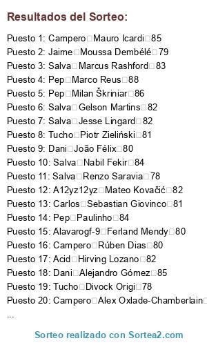 Lista de participantes: Dani Stephan El Shaarawy 82, Dani Aaron Wan-Bissaka 79, Carlos Abdou Diallo 79, Campero Abdoulaye Doucouré 81, Jaime Achraf HakimiL 79, A12yz12yz Adama Traoré 76, Caveman Adrien Rabiot 83, Campero Alban LafontL 79, Pep Alejandro Gómez 85, Javierux Aleksandar Kolarov 82, Alavarogf-9 Alessandro Florenzi 81, Dani Alessio Cragno 81, Caveman Alex Meret 78, Campero Alex Oxlade-Chamberlain 80, Alavarogf-9 Alex Teixeira 79, Campero Alex Telles 84, Tucho Alexandr Golovin 79, Javierux Alexandre Lacazette 86, Javierux Allan Saint-Maximin 79, Caveman Alphonse Areola 82, Carlos Ander Herrera 82, Salva André Gomes 80, Jaime André Onana 82, Carlos Andrea Belotti 82, Caveman Andrej Kramarić 83, Carlos Andrey Lunev 79, A12yz12yz Andriy Lunin 76, Pep Ángel Correa 82, Lucas Ángel Di María 86, Javierux Angeliño 79, Alavarogf-9 Ante Rebić 80, Carlos Anthony Martial 83, Salva Antonio Rüdiger 82, Carlos Arthur 84, Tucho Arthur Masuaku 76, A12yz12yz Arturo Vidal 84, Carlos Azpilicueta 84, Alavarogf-9 Badou Ndiaye 76, Jaime Benjamin Pavard 79, Pep Benjamin Verbič 79, Acid Bernd Leno 84, Campero Bruma 78, Acid Bruno Fernandes 85, A12yz12yz Capa 78, Pep Cédric Bakambu 82, Salva Chris Smalling 80, Dani Christian Luyindama 77, Carlos Christian Pulisic 79, Jaime Ciro Immobile 86, Caveman Clément Lenglet 85, Pep Cristian Pavón 78, Tucho Damián Suárez 79, Carlos Dani CeballosL 81, Tucho Daniele Rugani 82, Pep Danny da Costa 79, Dani David Abraham 78, Acid David Neres 81, Salva Davinson Sánchez 83, A12yz12yz Dayot Upamecano 77, Acid DeAndre Yedlin 76, Pep Denis Cheryshev 79, Carlos Denis Zakaria 78, Tucho Denzel Dumfries 78, A12yz12yz Deulofeu 80, A12yz12yz Diego Carlos 79, Tucho Divock Origi 78, Salva Dominik Livaković 79, Caveman Donny van de Beek 81, A12yz12yz Douglas Costa 84, Acid Éder Militão 81, Dani Edgar Manuel Guichón 78, Carlos Eduardo Salvio 80, Lucas Egidio Maestre Schetino 82, Javierux Eljero Elia 77, Carlos Elseid Hysaj 80, Caveman Emre Can 81, Pep Enzo Martín Riquero 79, Acid Eric Bailly 80, A12yz12yz Esteban Andrada 79, Lucas Éver Banega 83, Lucas Exequiel Palacios 77, Acid Ezequiel Lavezzi 79, Lucas Fabricio Bustos 77, Alavarogf-9 Ferland Mendy 80, Caveman Filip Kostić 82, Salva Franck Yannick Kessié 79, Alavarogf-9 Frank Acheampong 77, Alavarogf-9 Frank Fabra 77, Acid Fred 79, Carlos Frenkie de Jong 85, Caveman Gabriel Jesus 82, Pep Gabriel Paulista 82, Alavarogf-9 Gareth Bale 85, Carlos Gayà 80, Salva Gelson Martins 82, Javierux Geoffrey Kondogbia 81, Alavarogf-9 Georgiy Dzhikiya 78, Lucas Gerónimo Rulli 81, Lucas Giovani Lo Celso 83, Tucho Grimaldo 83, Campero Héctor Herrera 82, Campero Henrikh Mkhitaryan 81, Acid Henry Onyekuru 78, Acid Hirving Lozano 82, Dani Houssem Aouar 81, Jaime Ibrahima Konaté 79, Jaime Idrissa Gueye 83, Campero Iñaki Williams 82, Lucas Jadon Sancho 84, Pep Jaime Nicolás Frendado 81, Pep Jamie Vardy 82, Pep Jaume 76, Tucho Jean-Paul Boëtius 78, Acid Jean-Philippe Gbamin 79, Javierux Jérôme Boateng 84, Salva Jérôme Roussillon 82, Salva Jesse Lingard 82, A12yz12yz Jesús Navas 82, Javierux Jiří Pavlenka 84, Alavarogf-9 Joakim Mæhle 77, Campero João Cancelo 84, Dani João Félix 80, Lucas Joaquín Correa 80, Campero Joe Gomez 80, Caveman Joel Matip 82, Tucho Joel Robles 78, Jaime Jonathan Ikoné 78, Caveman Jordan Lukaku 77, Campero Jordan Pickford 83, Carlos Josef Martínez 81, Dani Joshua King 79, Acid Josué Chiamulera 83, Javierux Juan Cuadrado 83, Lucas Juan Musso 78, Javierux Juiano Mestres 82, Jaime Julian Brandt 84, Caveman Julian Draxler 83, Acid Junior Firpo 79, Alavarogf-9 Kai Havertz 84, Caveman Karim Bellarabi 82, Tucho Keita Baldé 80, Alavarogf-9 Kepa 84, Dani Kerem Demirbay 82, Carlos Kevin Mbabu 77, Tucho Kevin Vogt 80, A12yz12yz Kieran Tierney 76, Caveman Kingsley Coman 84, A12yz12yz Kostas Manolas 85, Dani Kyle Walker 84, Dani Lautaro Martínez 81, Lucas Leandro Paredes 80, Caveman Leon Bailey 82, Alavarogf-9 Leon Goretzka 84, Javierux Leonardo Pavoletti 78, Lucas Leonardo Sigali 79, Tucho Leroy Sané 86, Lucas Lisandro López 81, Lucas Lisandro Martínez 77, Jaime Lorenzo Pellegrini 79, Dani Loris KariusL 79, Alavarogf-9 Lucas Hernández 84, Salva Lucas Moura 83, Campero Luis Muriel 80, Alavarogf-9 Łukasz Fabiański 82, Alavarogf-9 Manuel Akanji 83, Tucho Manuel Lazzari 79, Javierux Marcano 79, Lucas Marcos Acuña 81, Salva Marcus Rashford 83, Javierux Mariano 79, Jaime Mario Hermoso 80, Pep Mário Rui 79, Campero Marouane Fellaini 76, Dani Martin ØdegaardL 78, A12yz12yz Mateo Kovačić 82, Salva Matías Vargas 77, Caveman Matías Zaracho 78, Salva Mattia Perin 82, Salva M'Baye Niang 77, Dani Memphis Depay 84, A12yz12yz Michail Antonio 78, Tucho Morales 81, Jaime Moussa Dembélé 79, Alavarogf-9 Moussa Marega 80, Acid Moussa Sissoko 81, Salva Nabil Fekir 84, Campero Naby Keïta 82, Dani Nacho Fernández 82, Jaime Nathan Aké 81, Lucas Nélson Semedo 82, Javierux Nick Pope 79, Jaime Nico Schulz 82, Lucas Nicolás Otamendi 83, Campero Nicolas Pépé 83, Lucas Nicolás Tagliafico 82, Tucho Ogenyi Onazi 76, Carlos Ousmane Dembélé 84, Jaime Oyarzabal 82, Pep Paulinho 84, Jaime Pierluigi Gollini 76, Tucho Piotr Zieliński 81, Carlos Presnel Kimpembe 82, Javierux Quincy Promes 82, Javierux Radja Nainggolan 83, Campero Raphaël Varane 85, Salva Raphinha 79, Caveman Renato Sanches 76, Salva Renzo Saravia 78, Caveman Ricardo Pereira 82, Salva Richarlison 79, Alavarogf-9 Riyad Mahrez 84, A12yz12yz Rodrigo 83, Pep Rodrygo 76, A12yz12yz Ronaldo Esler 78, Campero Rúben Dias 80, A12yz12yz Ryan Fraser 81, A12yz12yz Sander Berge 79, Acid Santiago Arias 79, Javierux Sebastian Giovinco 81, A12yz12yz Segundo Mandíquez 81, Campero Serge Gnabry 84, Dani Sergi Roberto 82, Pep Sergio Asenjo 82, Pep Sokratis 84, Dani Stanislav Lobotka 79, Jaime Steven Bergwijn 82, Javierux Taison 82, Jaime Tanguy Ndombele 81, Campero Theo Hernández 76, Caveman Thilo Kehrer 79, Pep Thomas Delaney 82, Alavarogf-9 Thomas Meunier 82